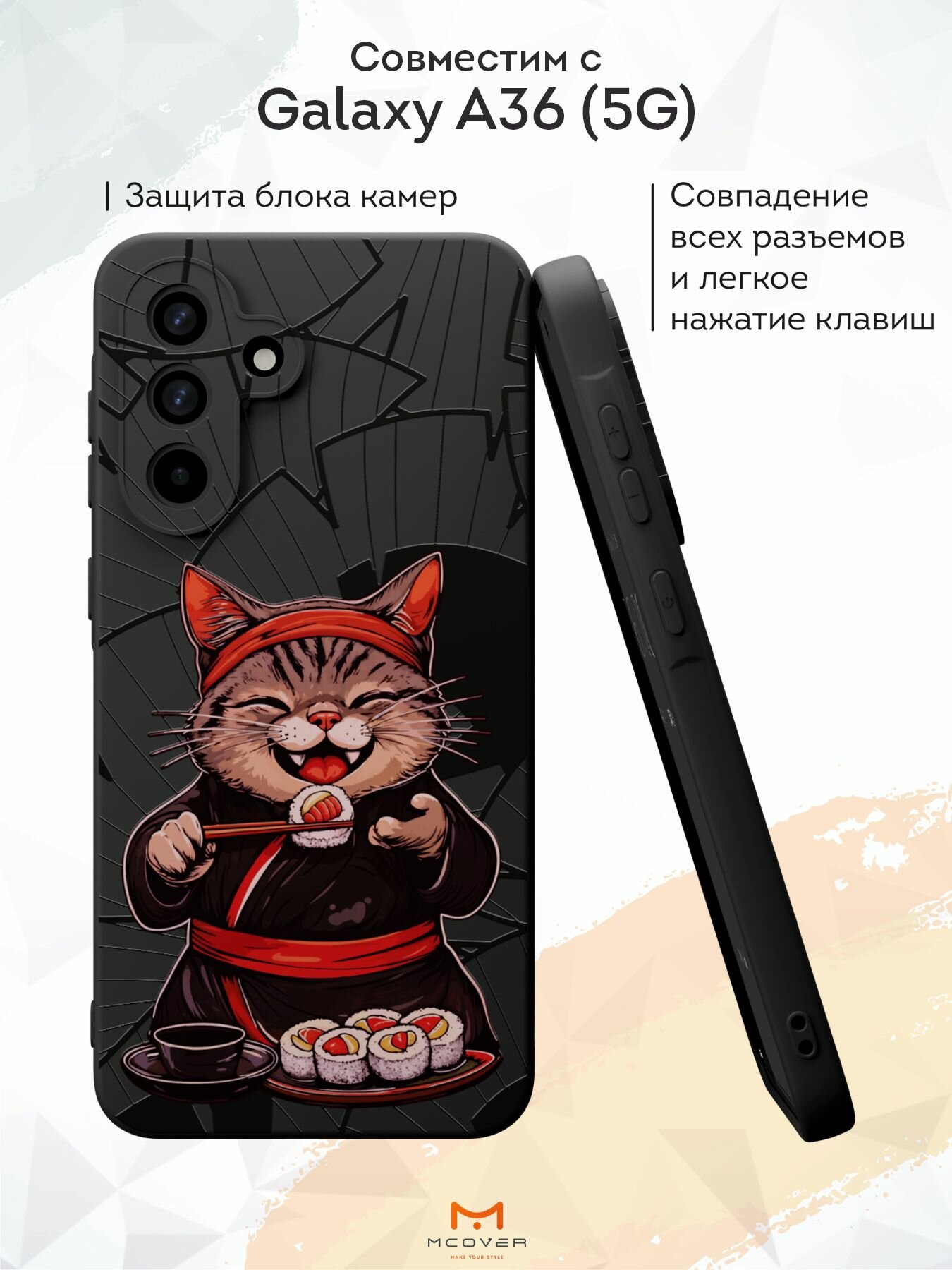 Силиконовый чехол Mcover на Galaxy A36 (5G), с принтом Кот в кимоно, черный, с защитой камеры 530 ₽