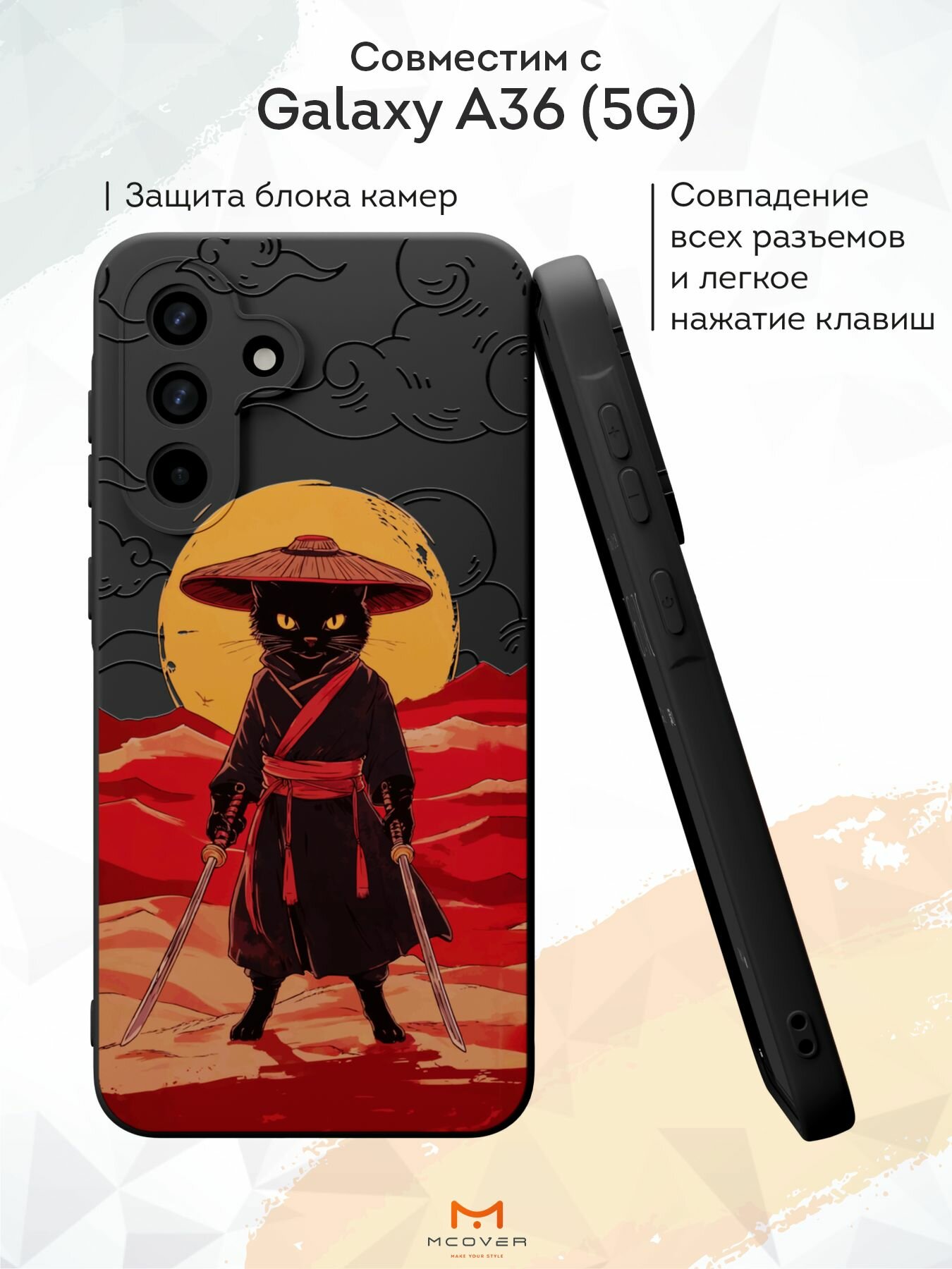 Силиконовый чехол Mcover на Galaxy A36 (5G), с принтом Кот в кимоно, черный, с защитой камеры 530 ₽
