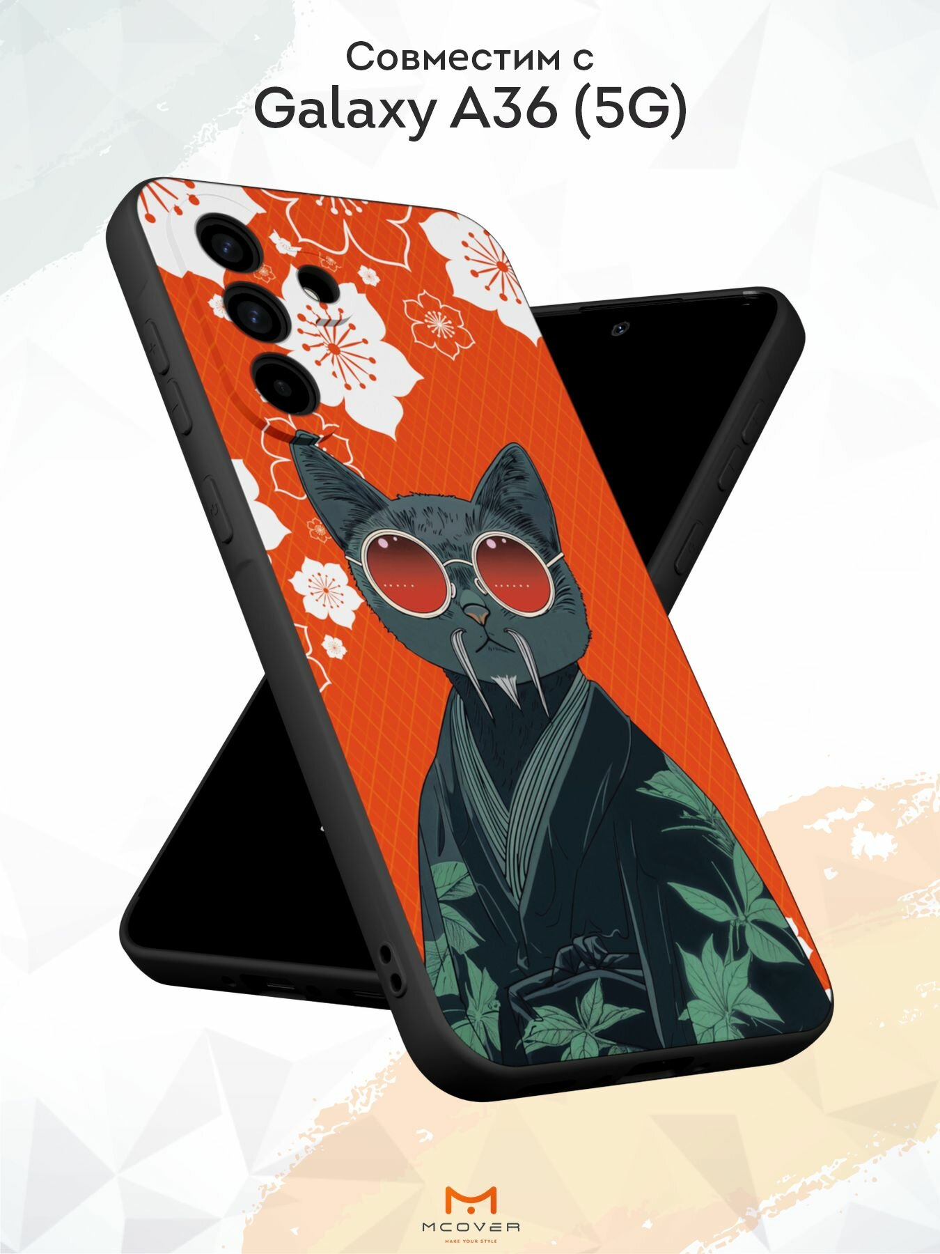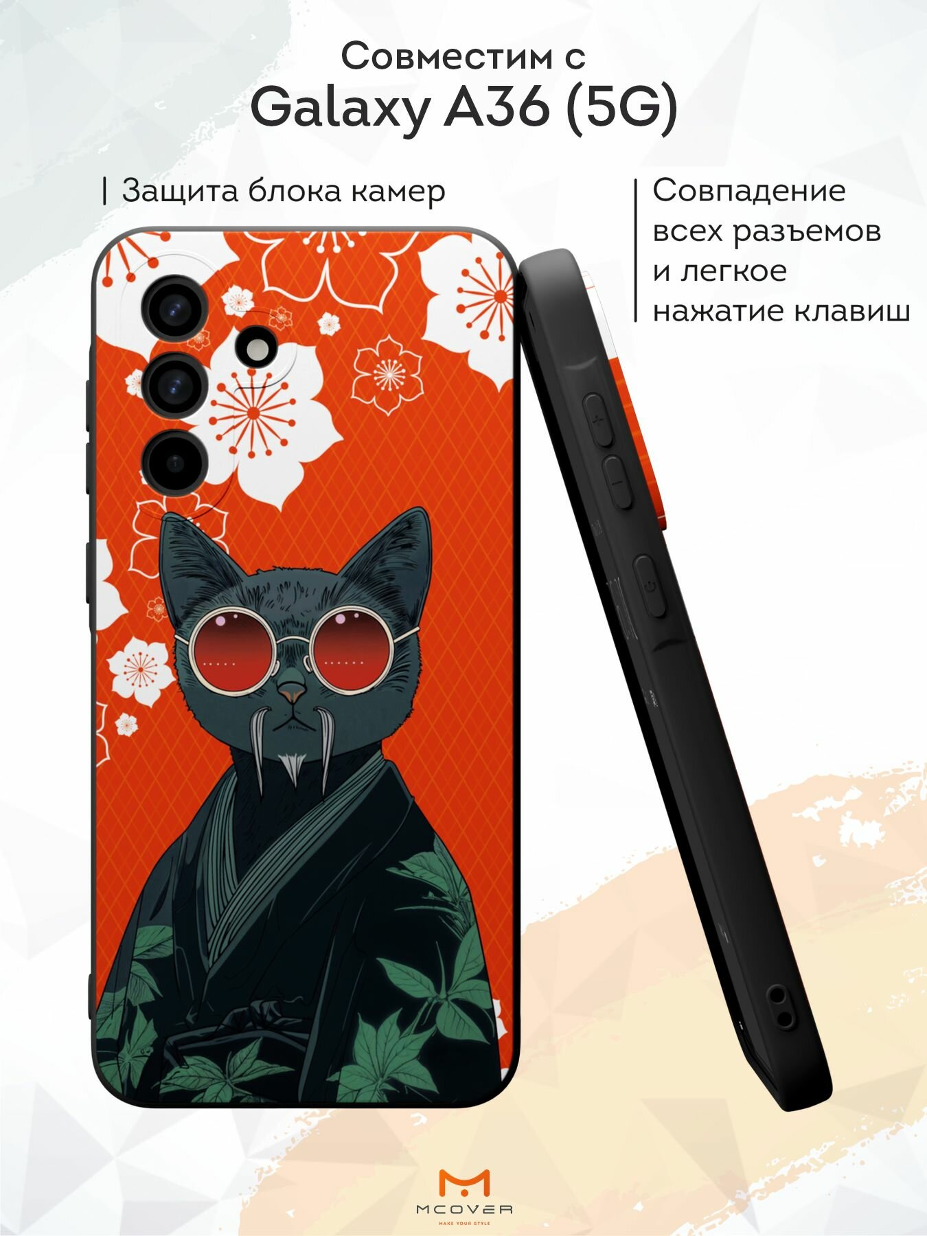 10 цен на Силиконовый чехол Mcover на Galaxy A36 (5G), с принтом Кот японец в очках, черный, с защитой камеры