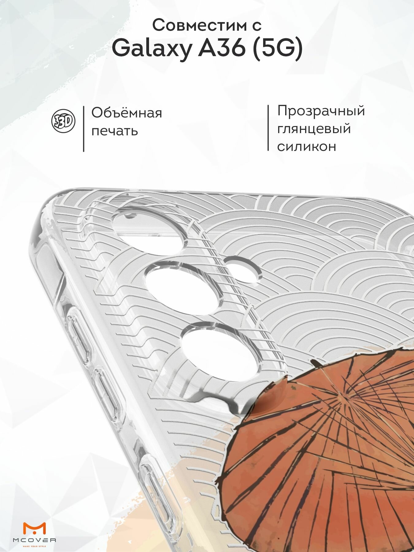 Силиконовый чехол Mcover на Galaxy A36 (5G), с принтом Кот с веером, прозрачный, с защитой камеры 530 ₽