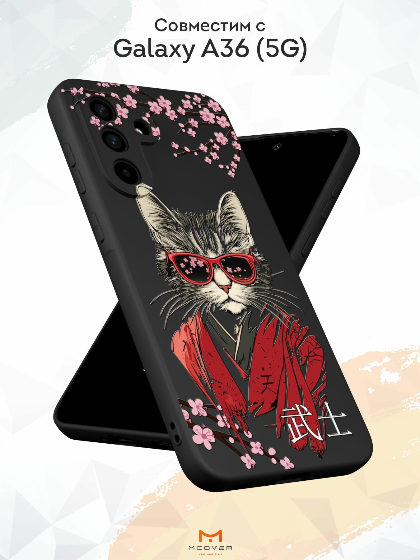 Силиконовый чехол Mcover на Galaxy A36 (5G), с принтом Кот в кимоно, черный, с защитой камеры 530 ₽