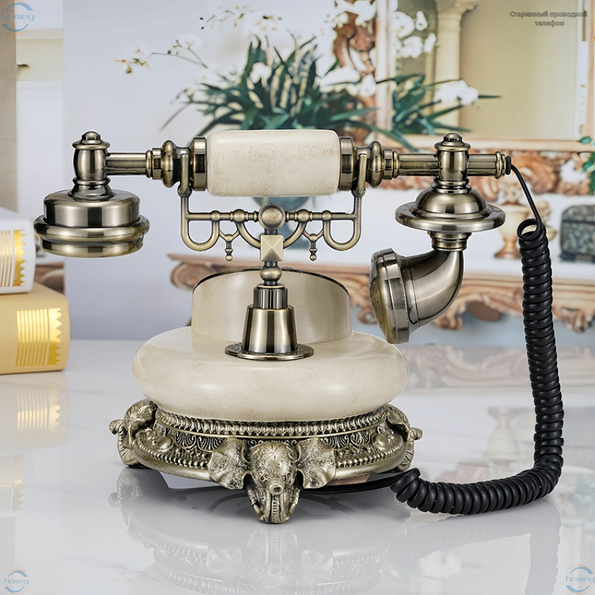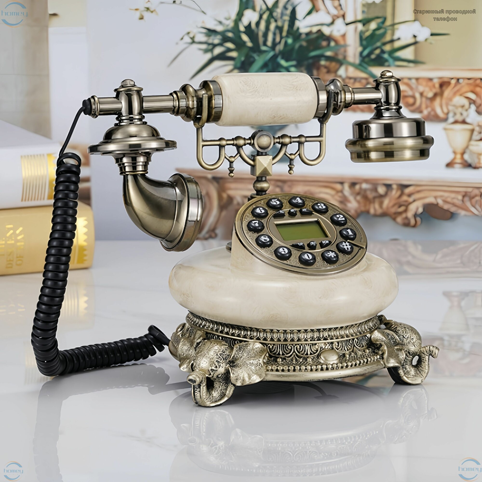 10 цен на Винтажный проводной телефон из цветного камня - спикерфон, подсветка, мелодия звонка