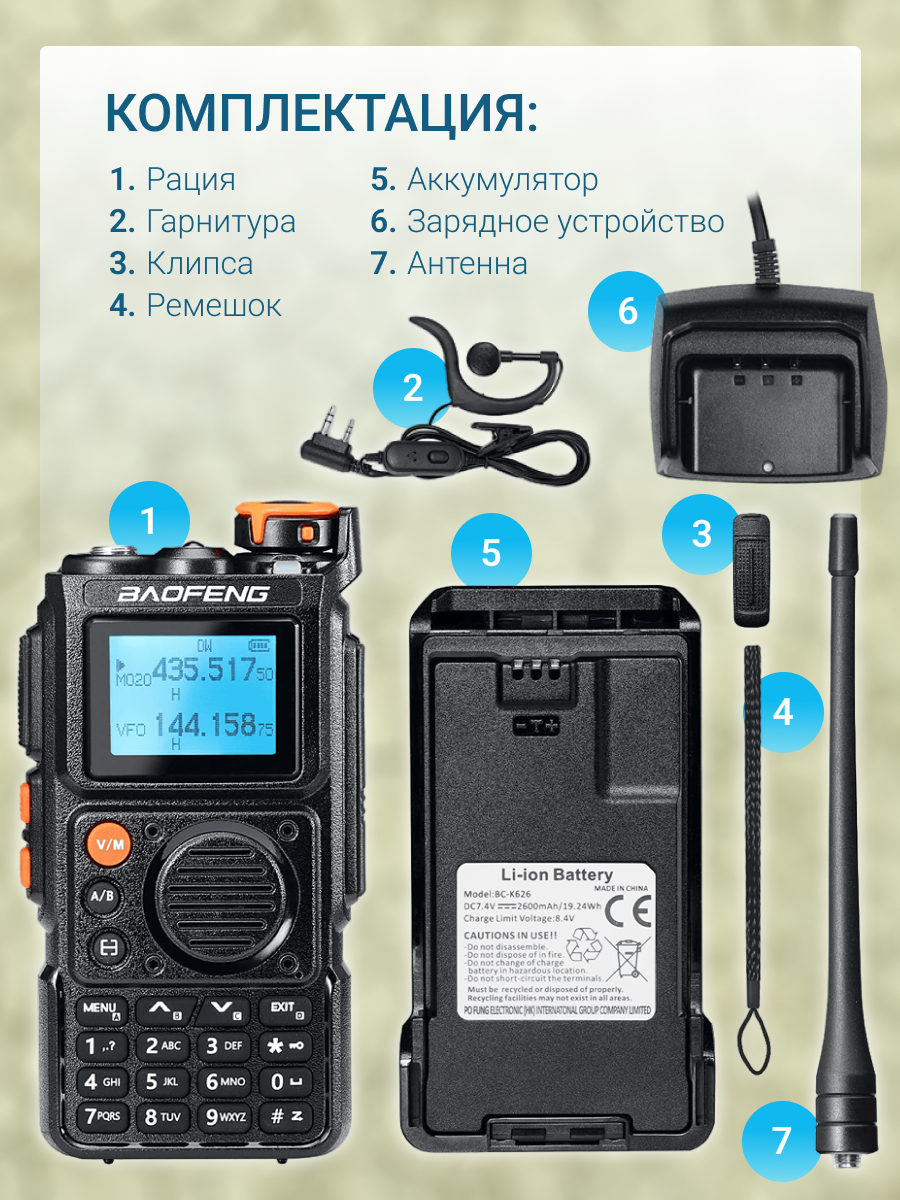 Радиостанция Baofeng BF-K6 аналоговая, 6 Вт, 2600 мАч, 136-174 МГц, 200-260 МГц , 400 - 520 МГц, с фонариком информация: