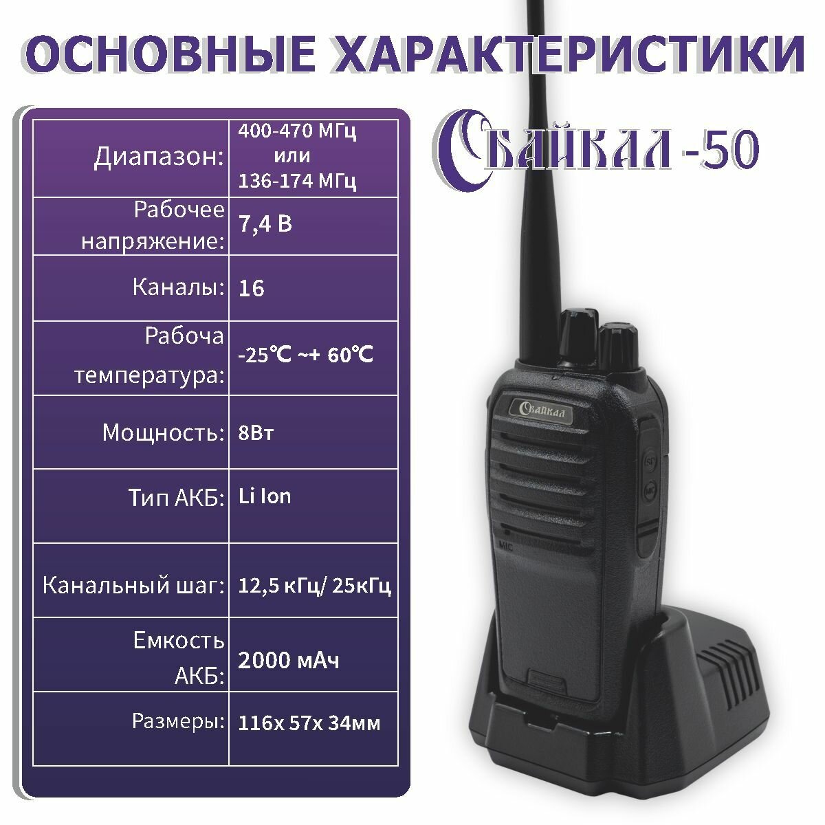 Рация БАЙКАЛ-50, 8 Вт, 2 режима мощности, 2000 мАч, 136-174 МГц информация: