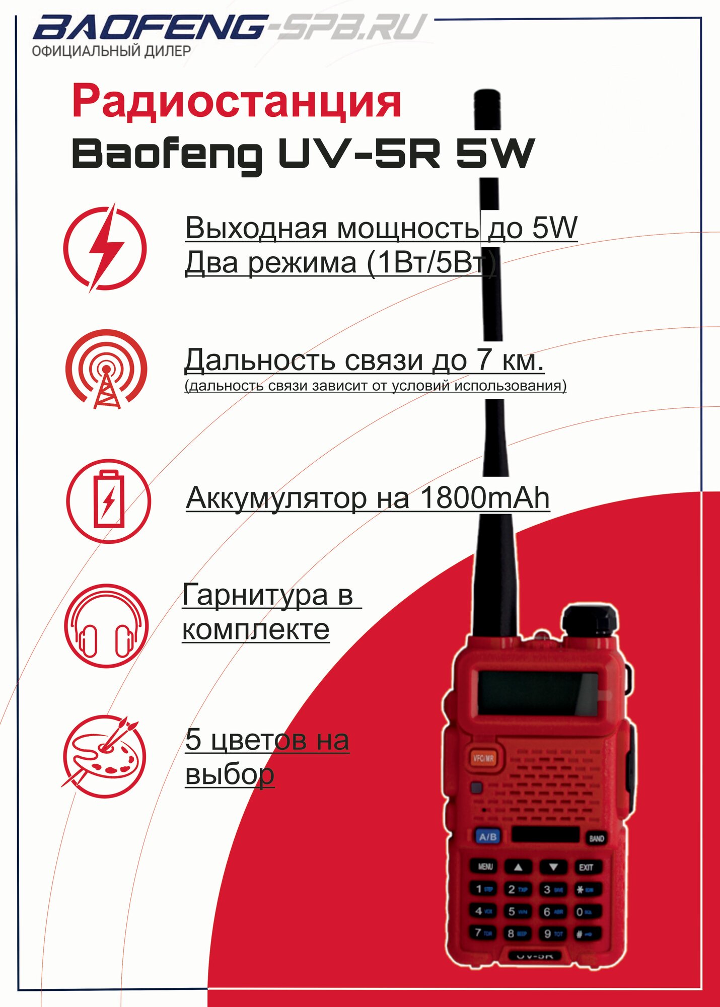 Радиостанция (рация) Baofeng UV-5R цветная Red (красный) информация: