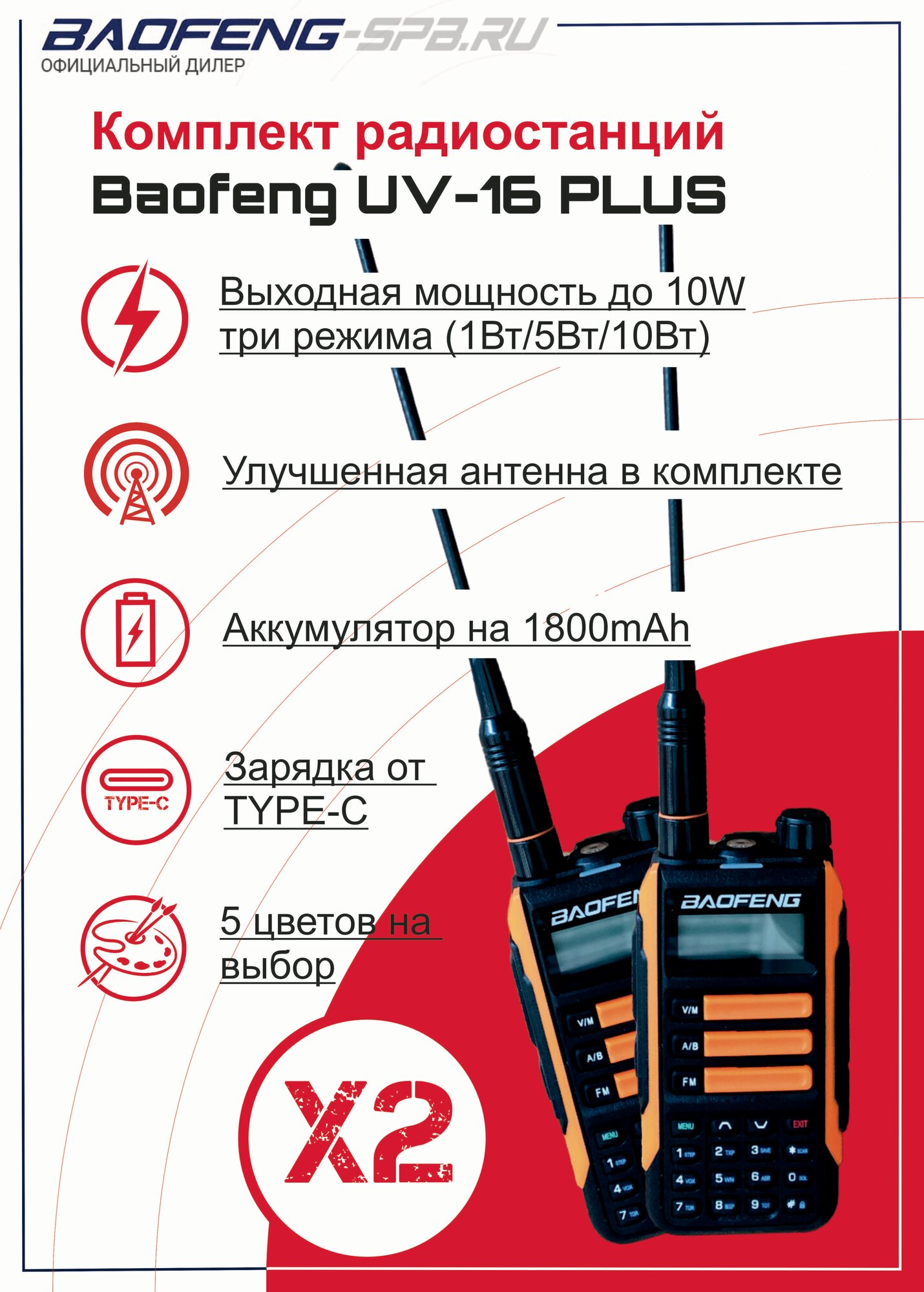 10 цен на Комплект раций Baofeng UV-16 Plus оранжевые (Зарядка TYPE-C) 3 режима мощности 10W