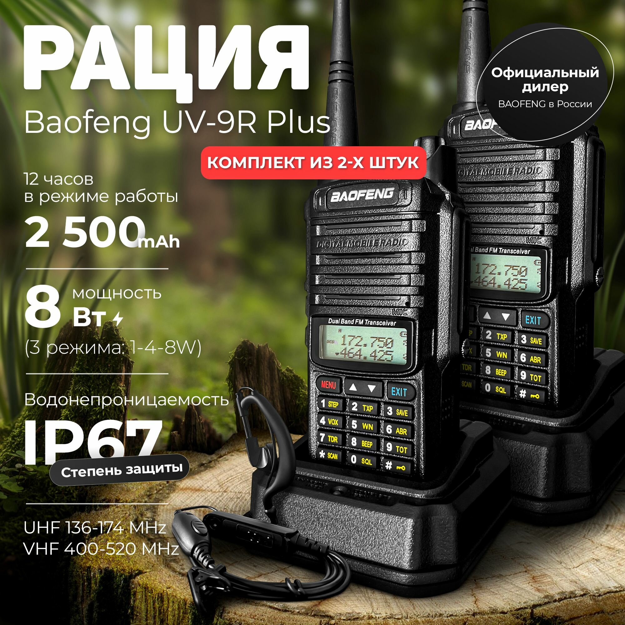 Комплект раций 2 шт. Baofeng UV-9R PLUS 8W + Гарнитура для охоты и рыбалки, для туризма, автомобильная, для стройки, страйкбола информация: