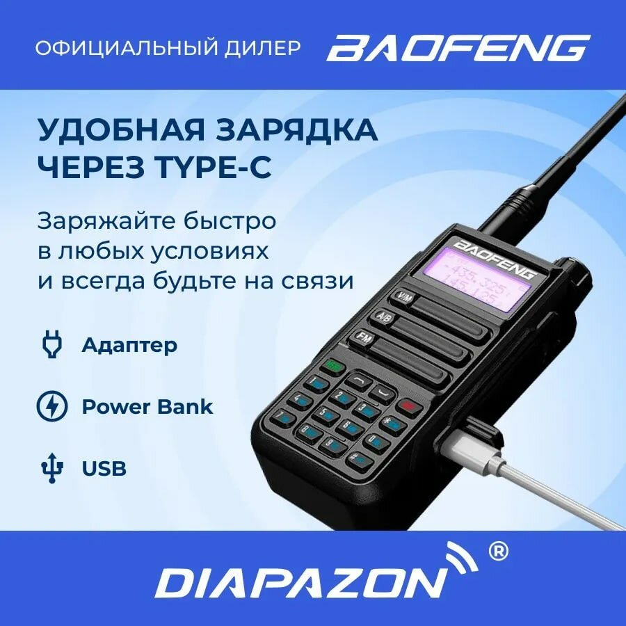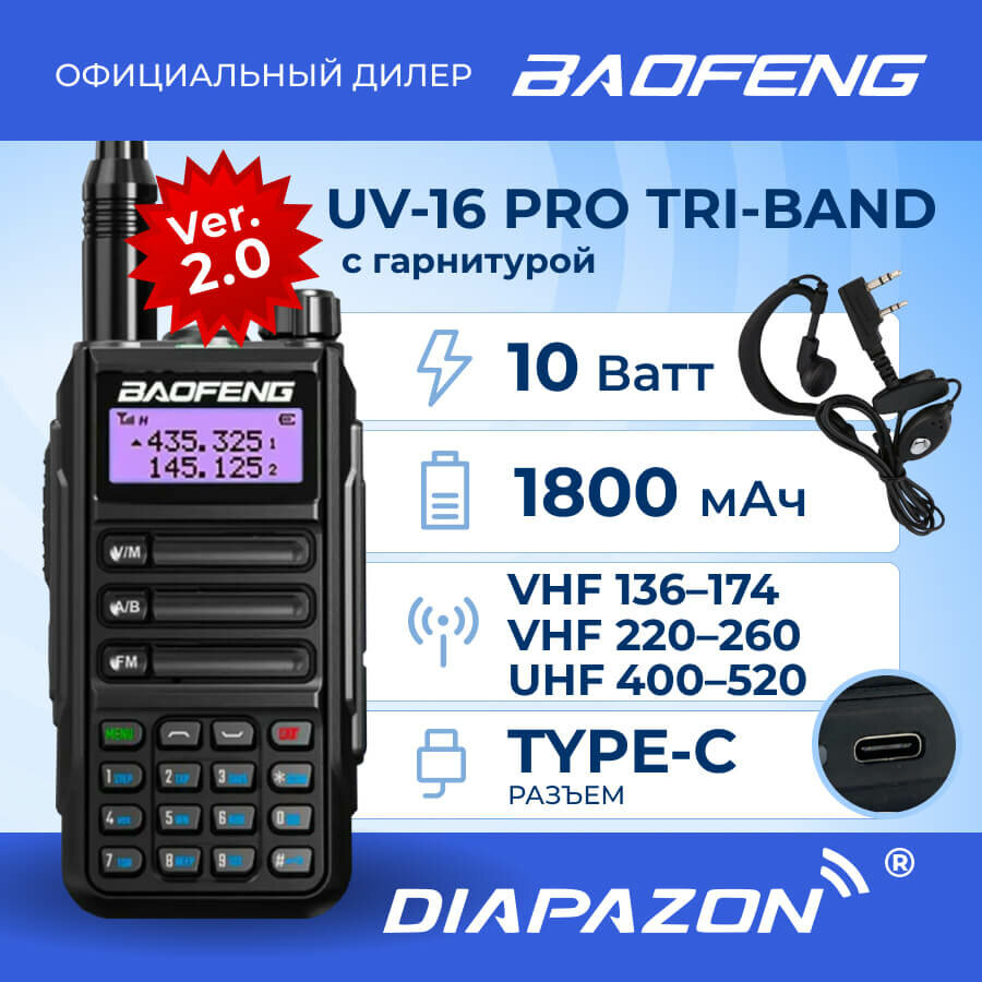 Рация BAOFENG UV-16 PRO TRI BAND TYPE-C, 10 Ватт, с гарнитурой в комплекте, цвет черный информация: