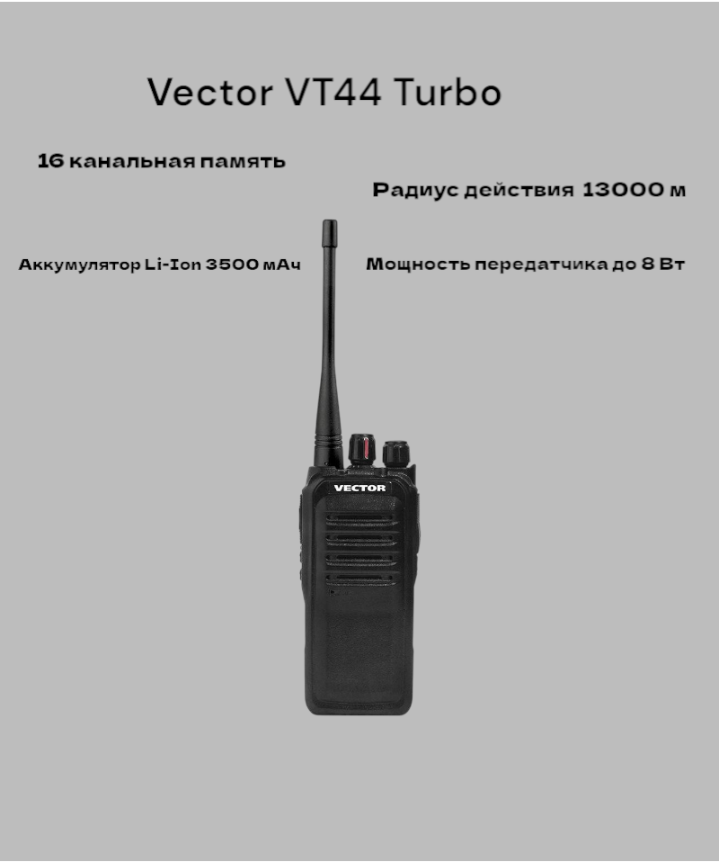 Рация VECTOR VT-44 Turbo, безлицензионная, 8Вт, черная, 77 каналов, Li-Ion аккумулятор 3500мАч информация: