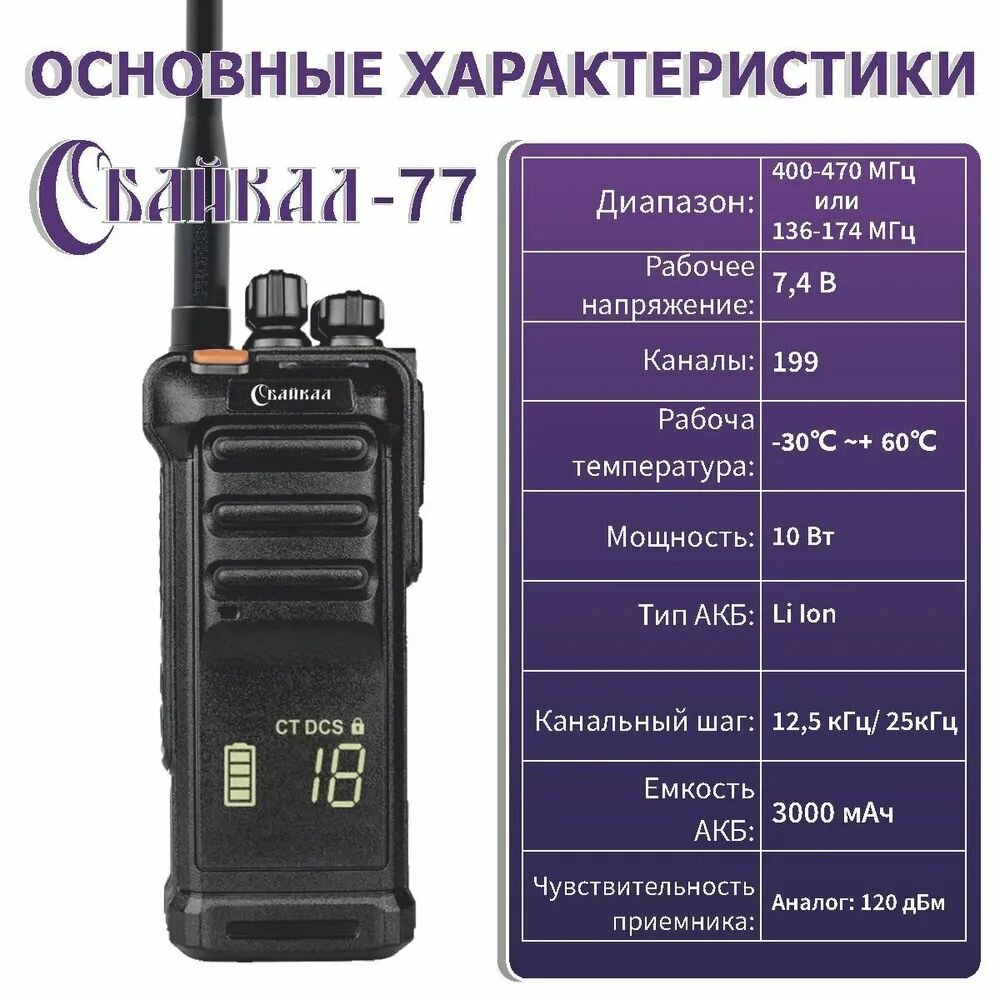 Рация Байкал-77, 400-470 МГц, 10Вт, 3000 мАч ,199 кан, супергетеродин, черная информация: