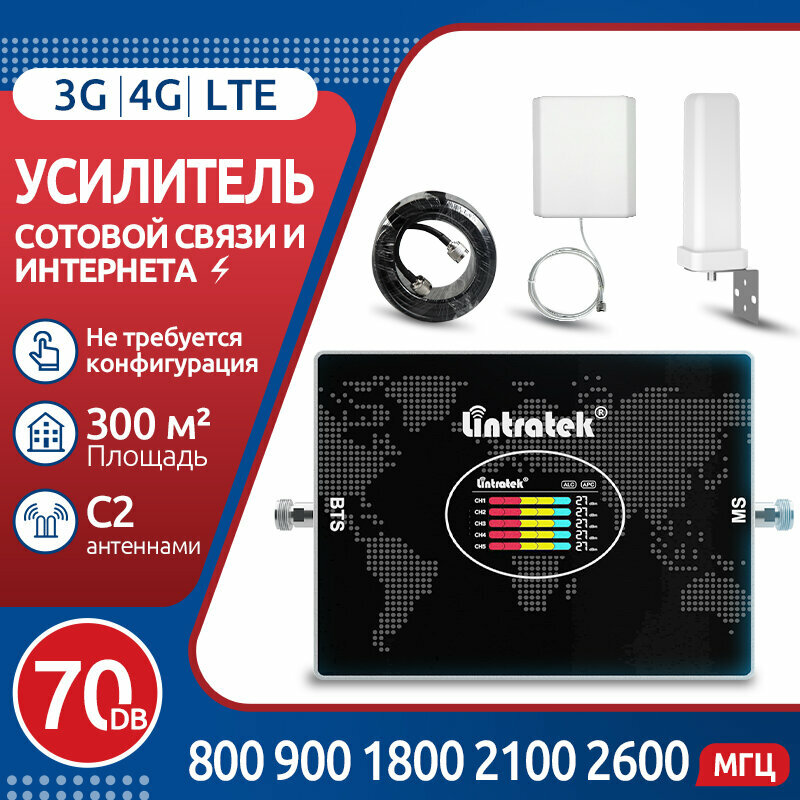 Усилитель сотовой связи Lintratek 5 диапазонов 800-2600 МГц с AGC антенна 4G 15м кабель 400 м² покрытие