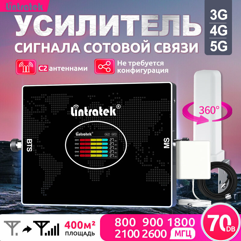 Усилитель сотовой связи Lintratek 5 диапазонов 800-2600 МГц с AGC антенна 4G 15м кабель 400 м² покрытие