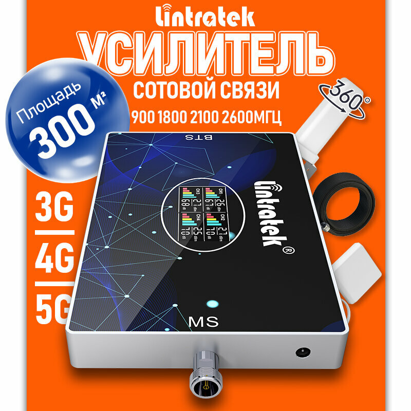 Усилитель сотовой связи Lintratek 5 диапазонов 800-2600 МГц с AGC антенна 4G 15м кабель 400 м² покрытие