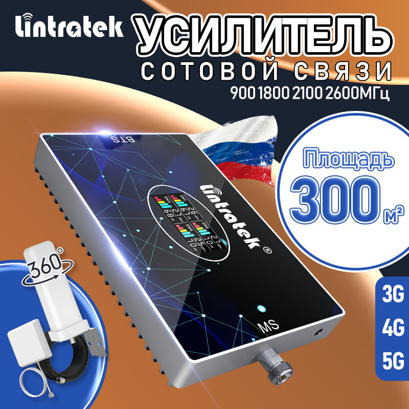 Усилитель сотовой связи Lintratek 5 диапазонов 800-2600 МГц с AGC антенна 4G 15м кабель 400 м² покрытие