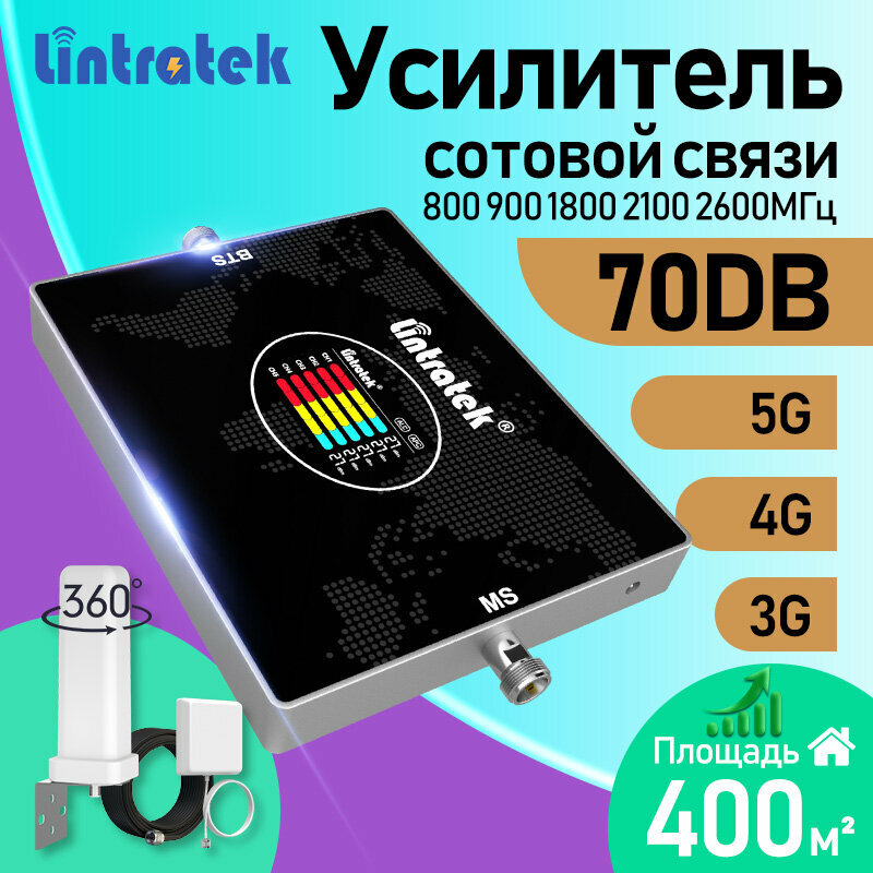 Усилитель сотовой связи Lintratek 5 диапазонов 800-2600 МГц с AGC антенна 4G 15м кабель 400 м² покрытие