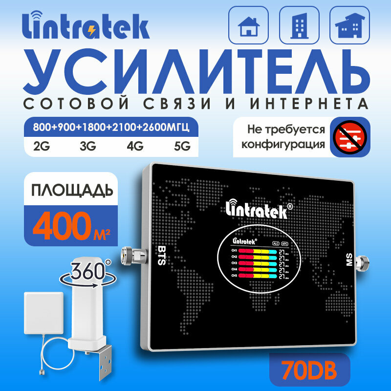 Усилитель сотовой связи Lintratek 5 диапазонов 800-2600 МГц с AGC антенна 4G 15м кабель 400 м² покрытие