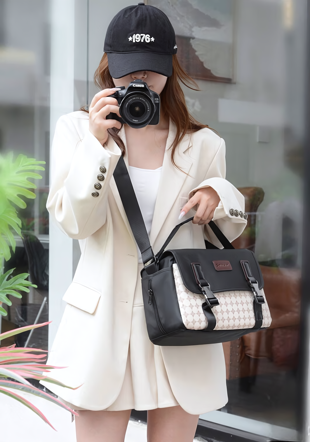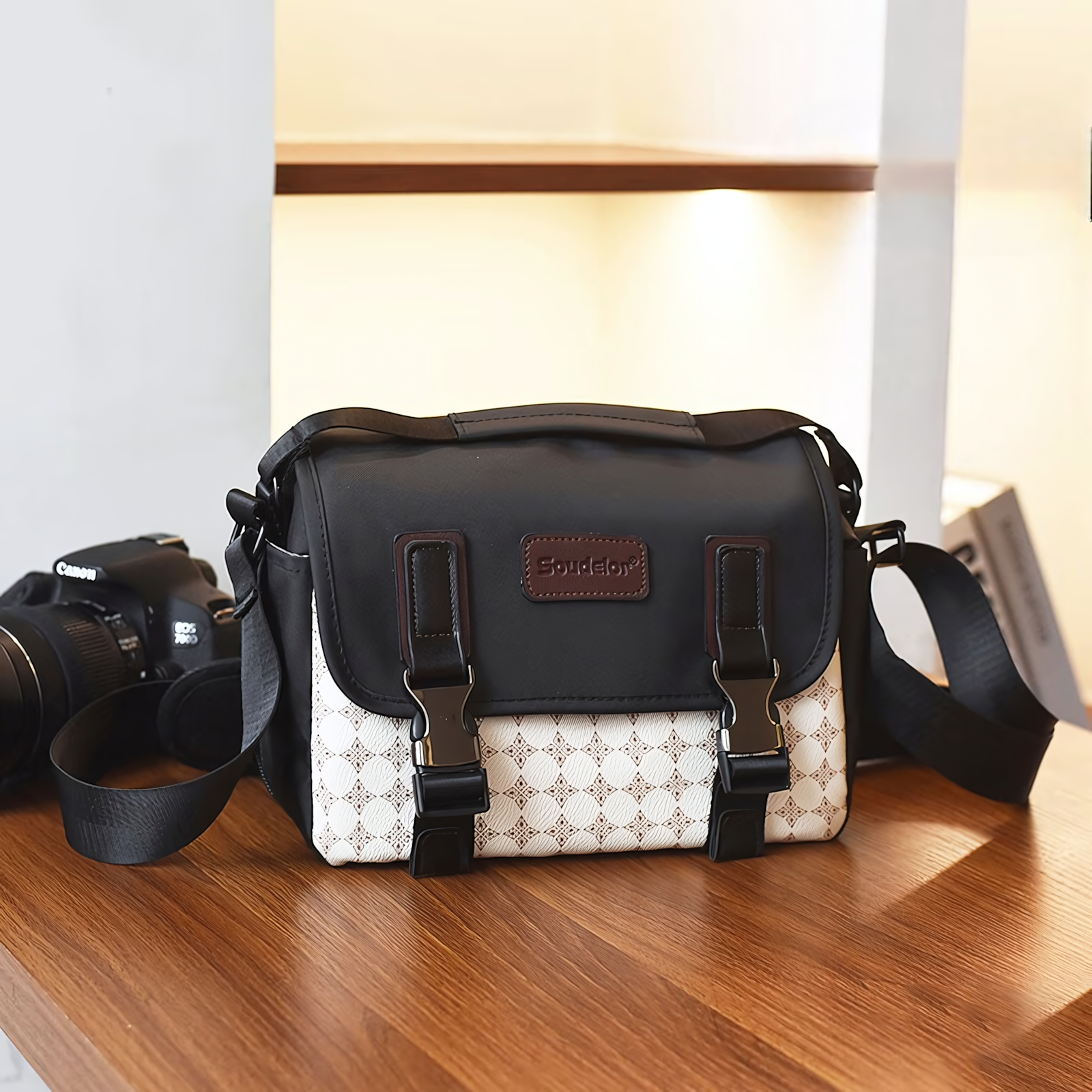 10 цен на Сумка для фотокамеры, водонепроницаемая ткань, 3 отделения, плечевой ремень, черная в бежевую клетку, 24х13х17 см