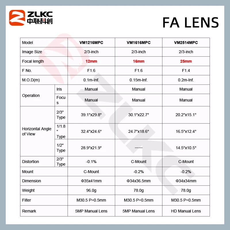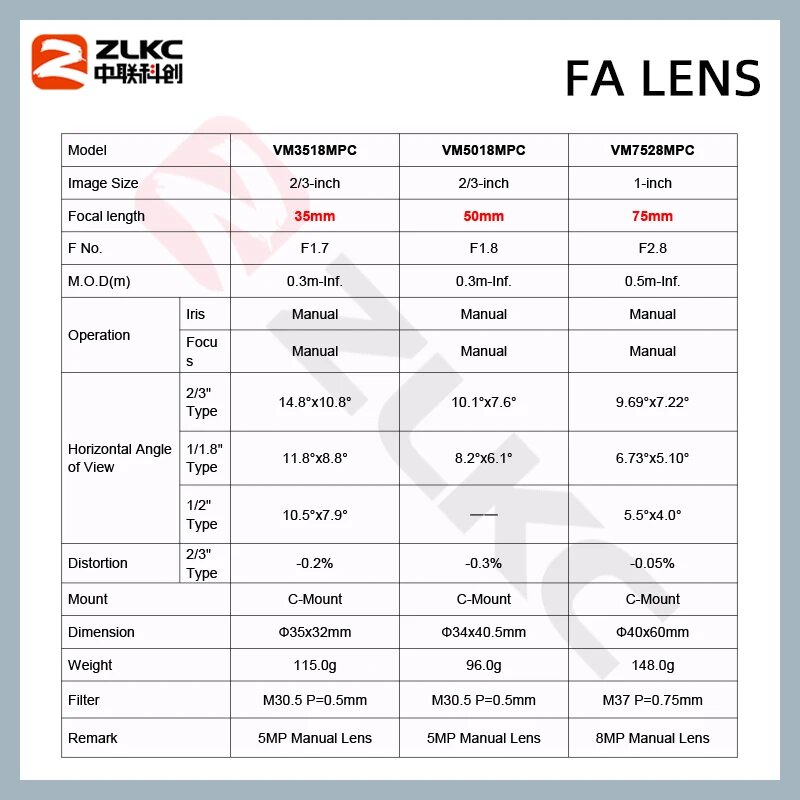 Объективы ZLKC для промышленных камер 5Мп 5-75мм, 4mm VM0418MPC, С Рот информация: