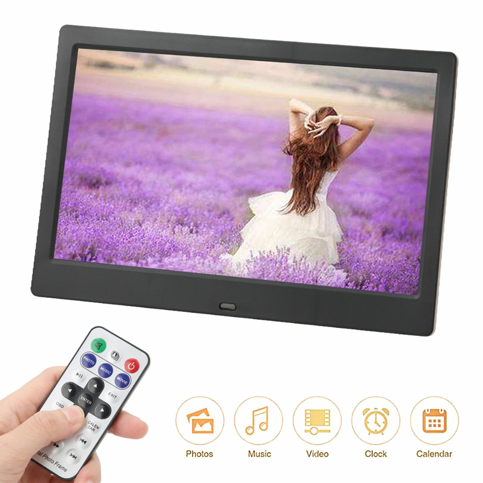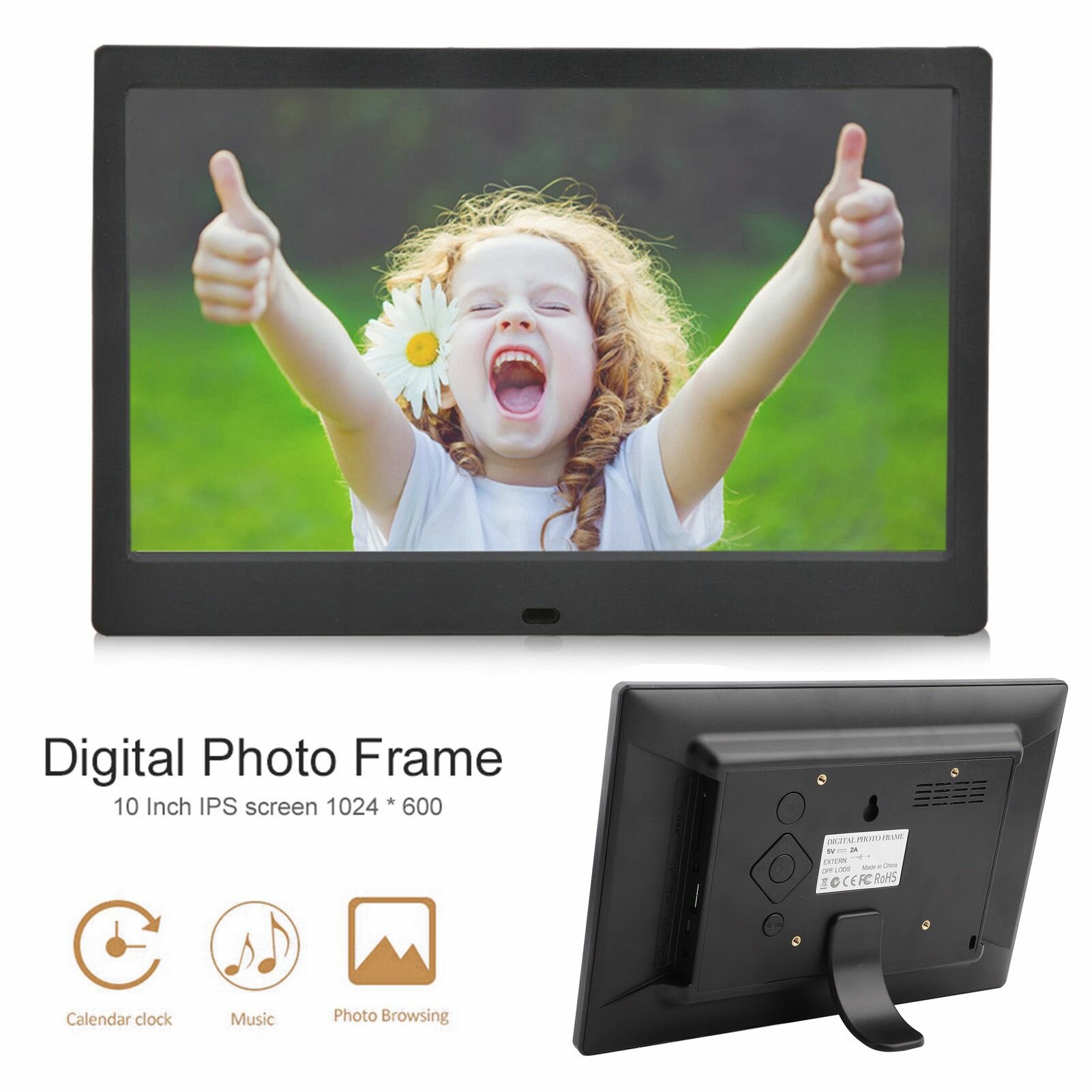 10-дюймовый цифровой фоторамка с разрешением 1024*600, поддержка нескольких языков, автоматическое включение/выключение, черный информация: