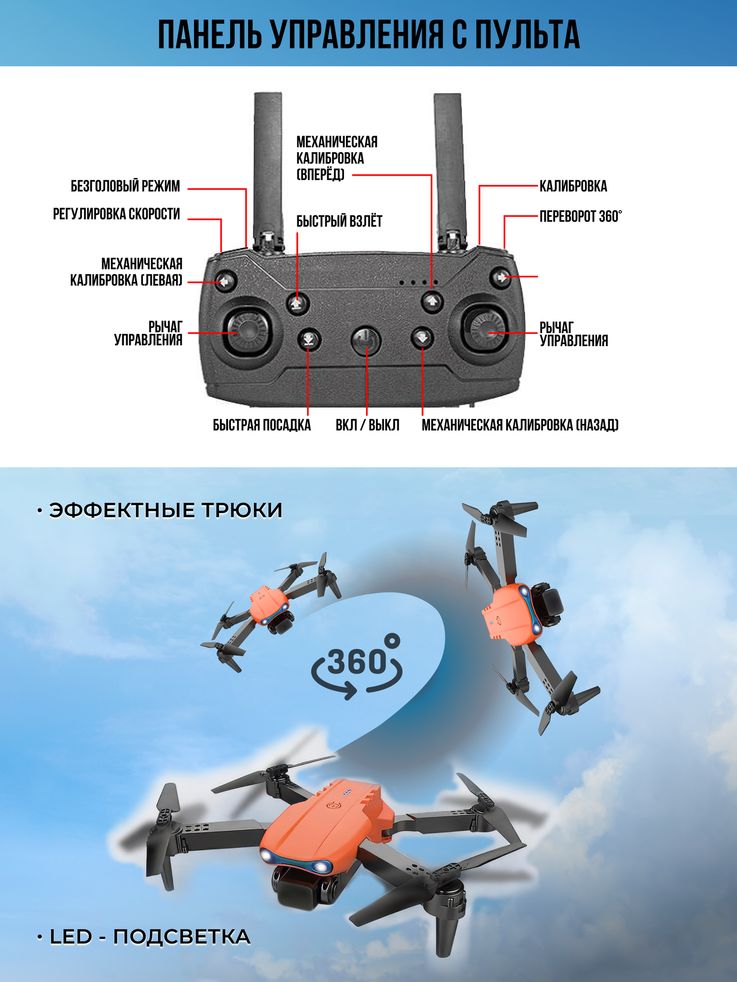 Отзывы на Игрушка детский квадрокоптер с пультом управления без камеры 26 см, гироскоп, разворот 360, с аккумулятором, световые эффекты