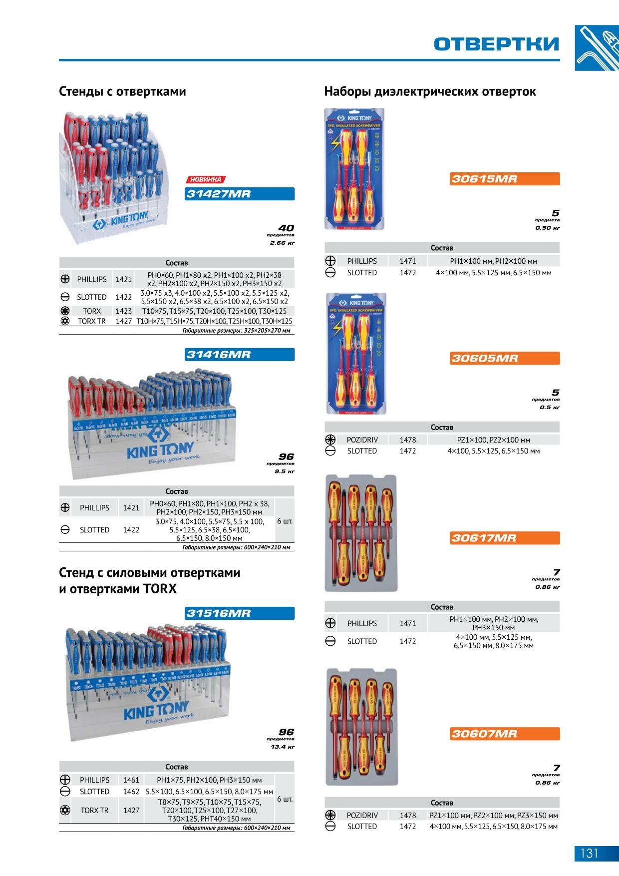 Стенд с силовыми отвертками и отвертками TORX, серии 1461, 1462, 1427, 96 предметов KING TONY 31516MR информация: