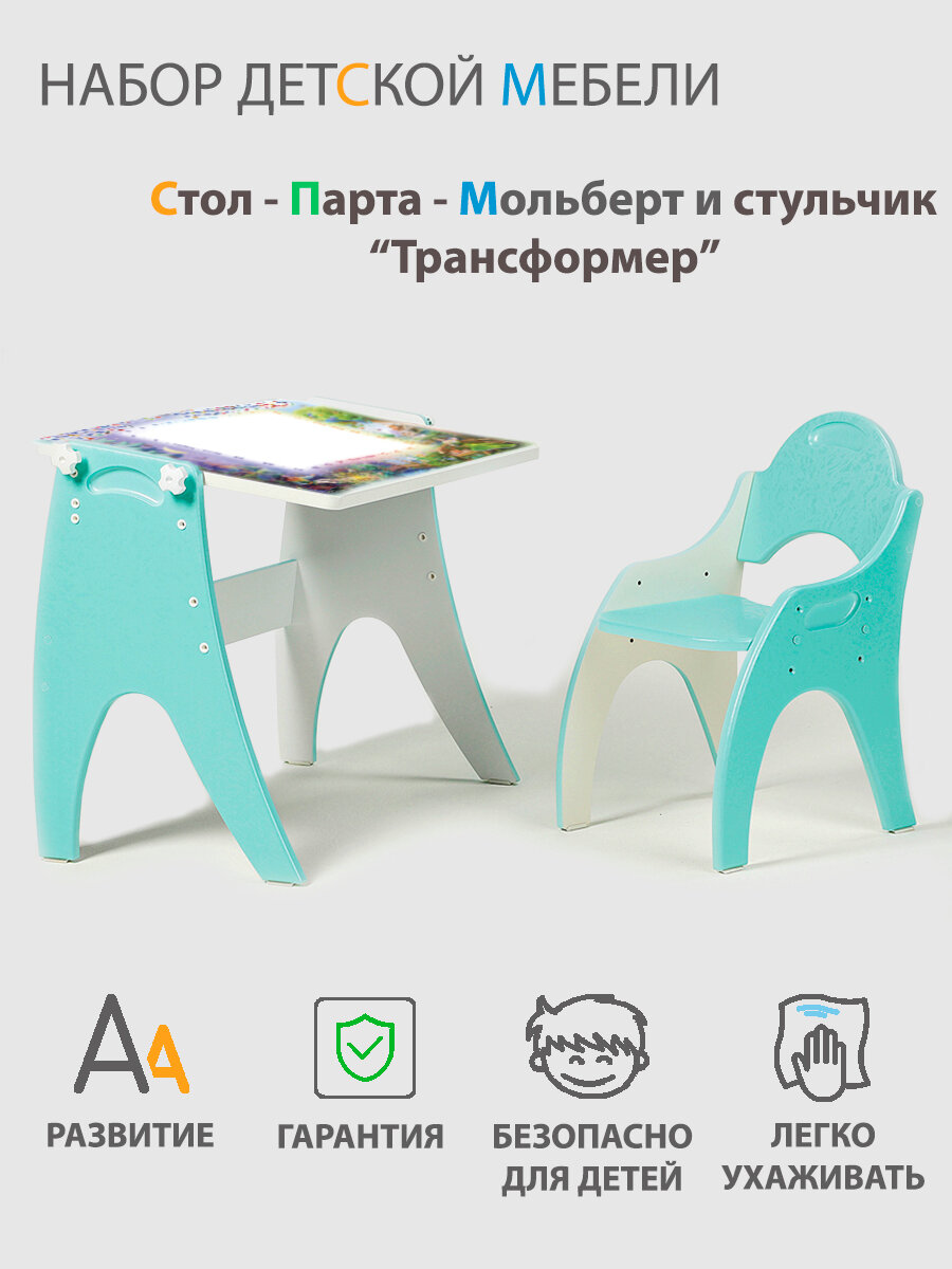 Растущий набор детской мебели Стол - Парта - Мольберт и стульчик "Трансформер" цвет Бирюзовый информация: