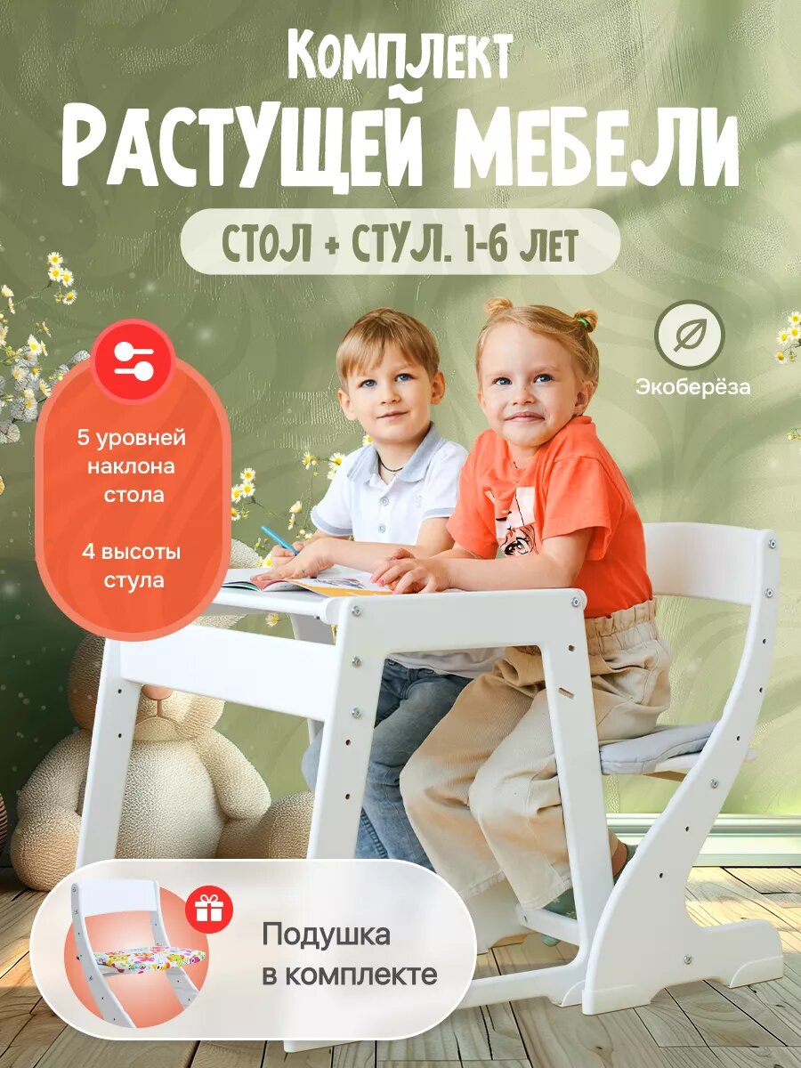 Комплект растущей мебели, детский стул и стол Друг Кузя белый подушечка совушки информация:
