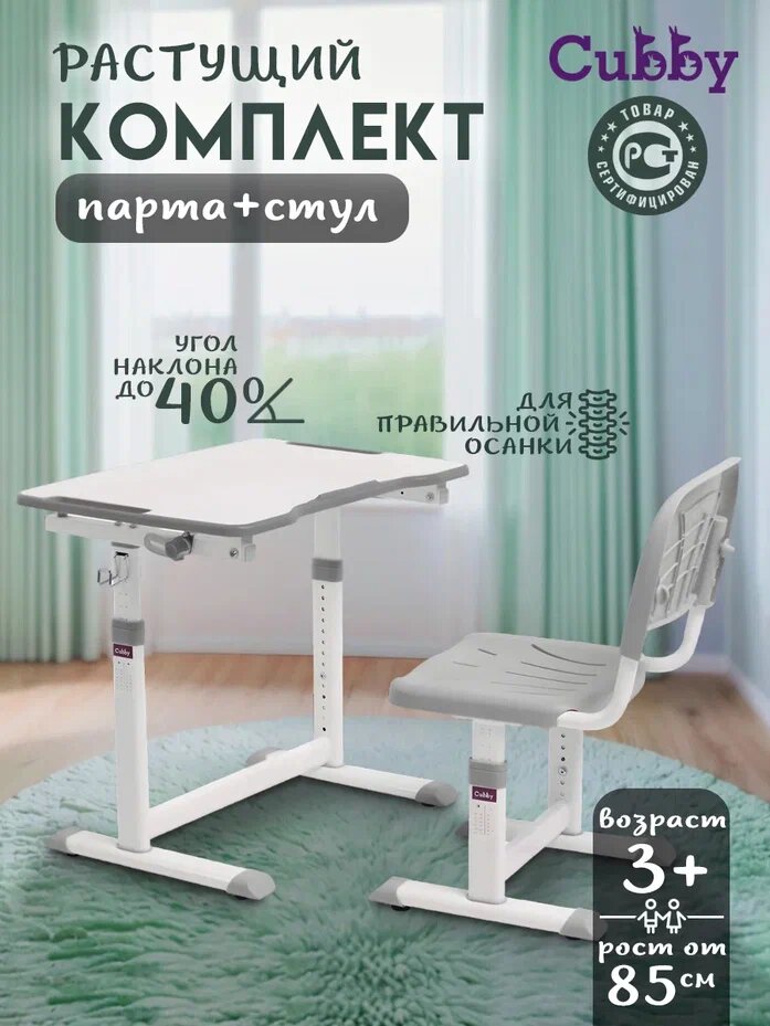 Растущая парта Cubby Olea, со стульчиком, наклоняемая поверхность, регулируемая высота, серая информация: