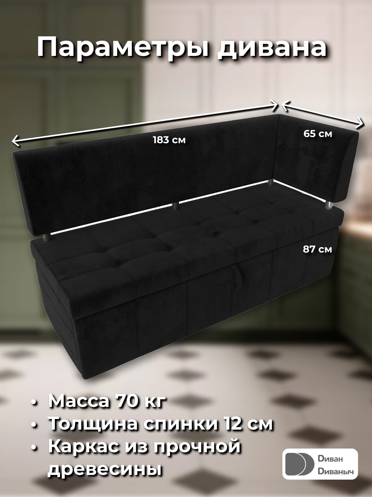 Диван кухонный прямой Лотос со спальным местом 100х170 см, угол справа, Велюр черный информация: