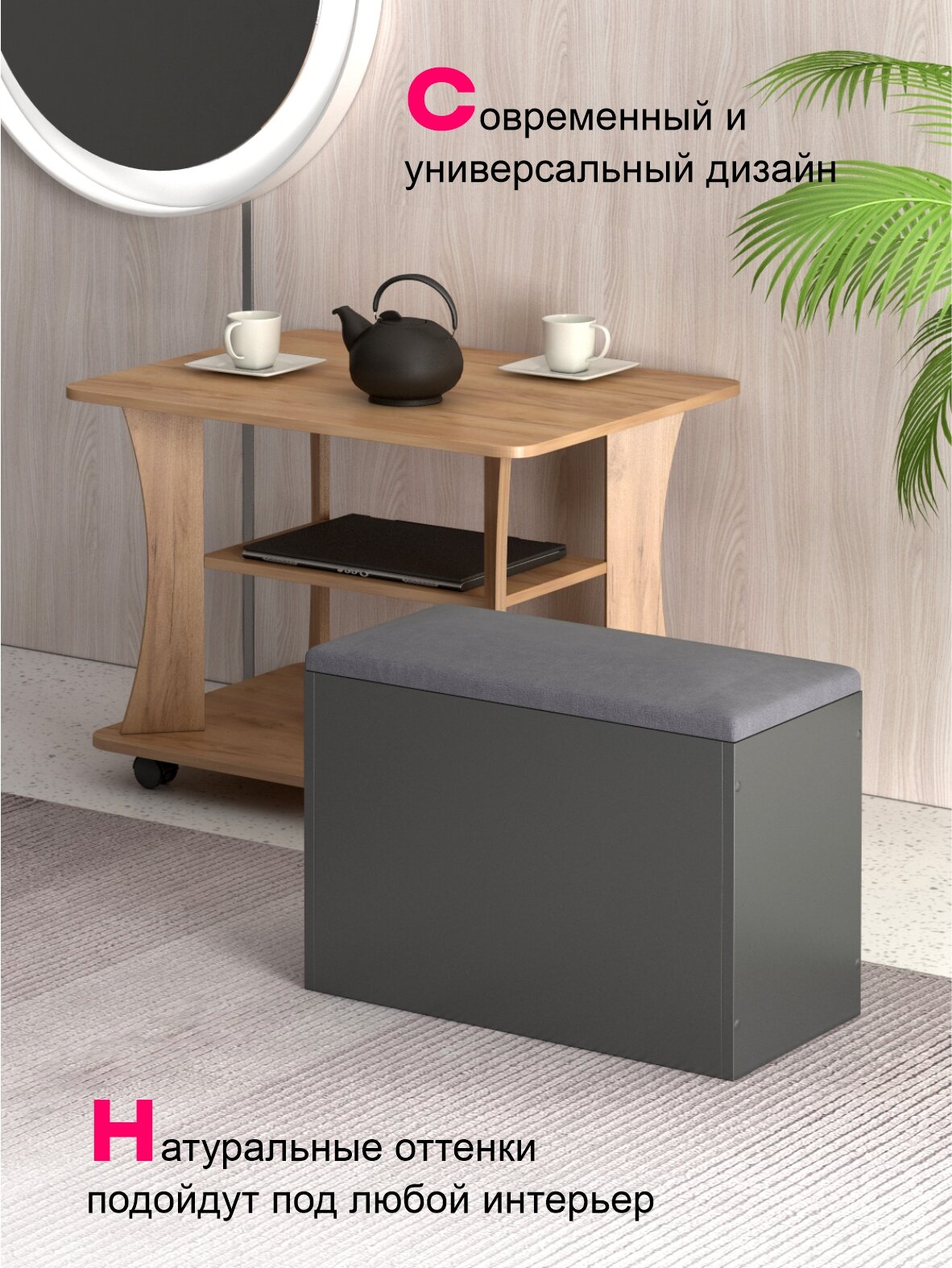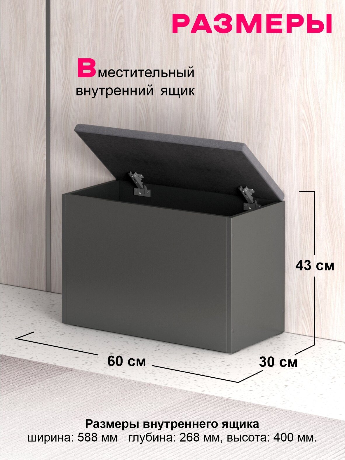 Пуфик в прихожую с ящиком для хранения Арт 2, Графит Серый/Велюр Графит информация: