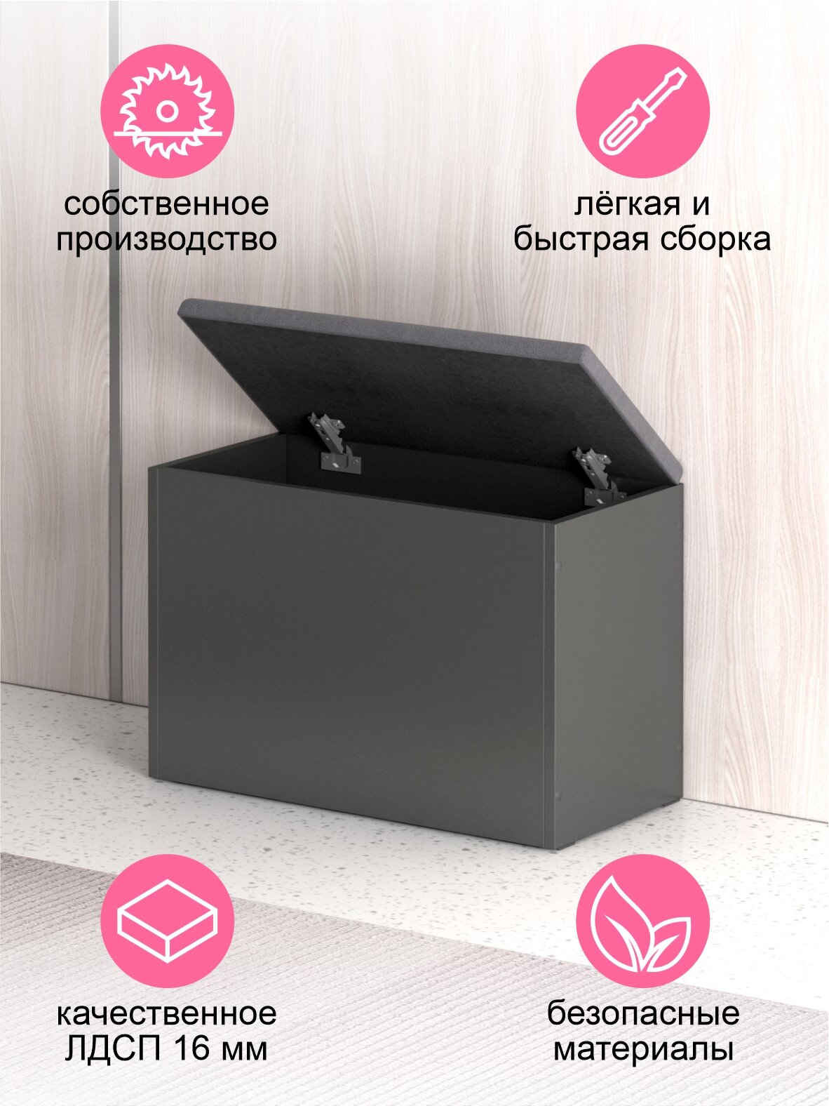 Отзывы на Пуфик в прихожую с ящиком для хранения Арт 2, Графит Серый/Велюр Графит