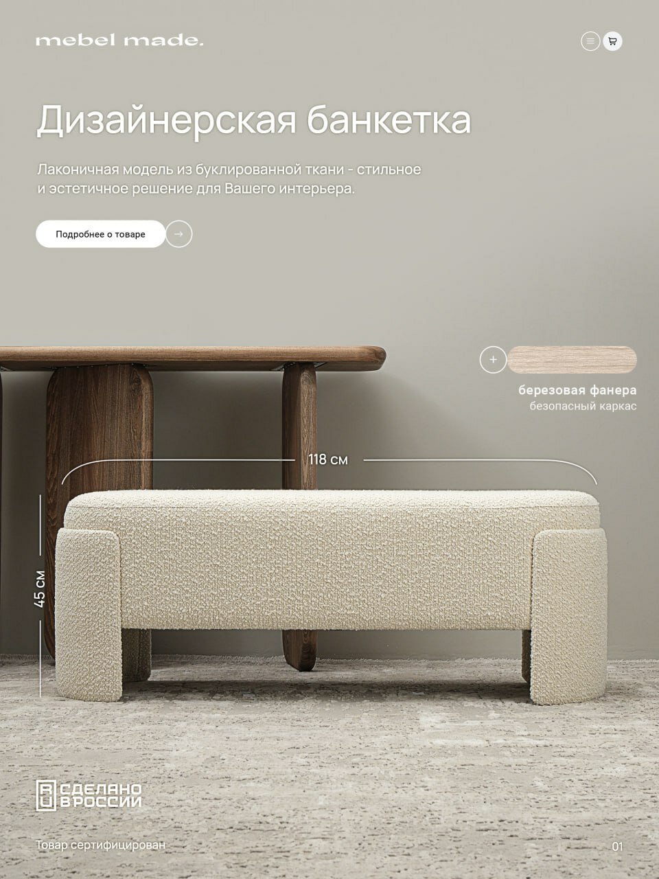 Пуфик в прихожую букле White Polly maxi 1180мм*450мм*380мм информация: