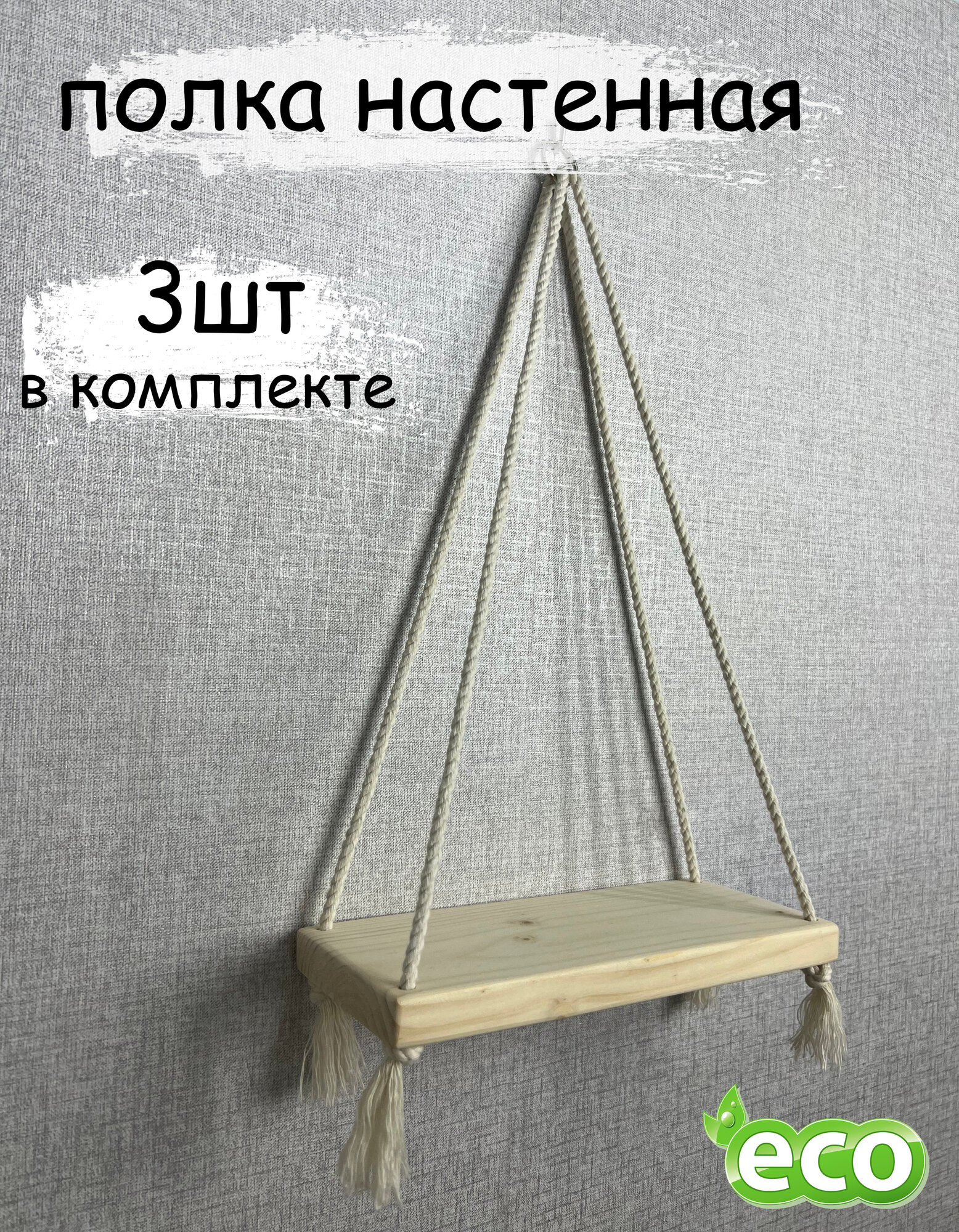 Отзывы на Полка настенная прямая из дерева на веревках подвесная светлая 24х10х38 см, комплект 3 шт.