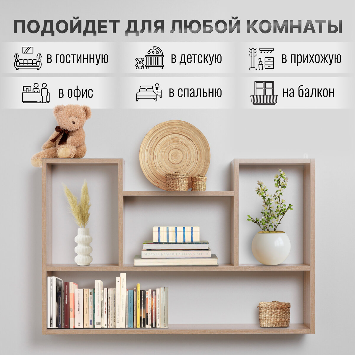 10 цен на Полка настенная навесная универсальная, Дуб Сонома, 93,5х60х16 см, ЛДСП