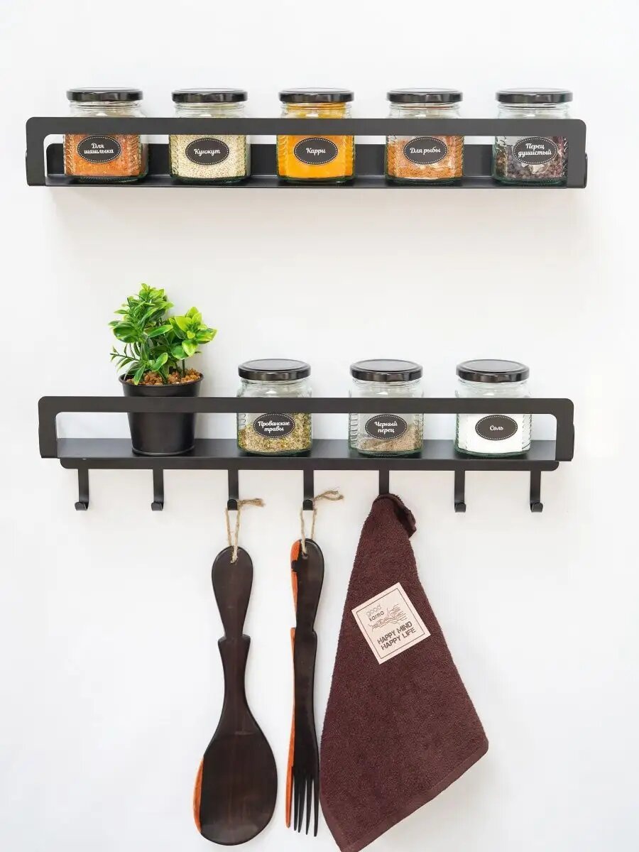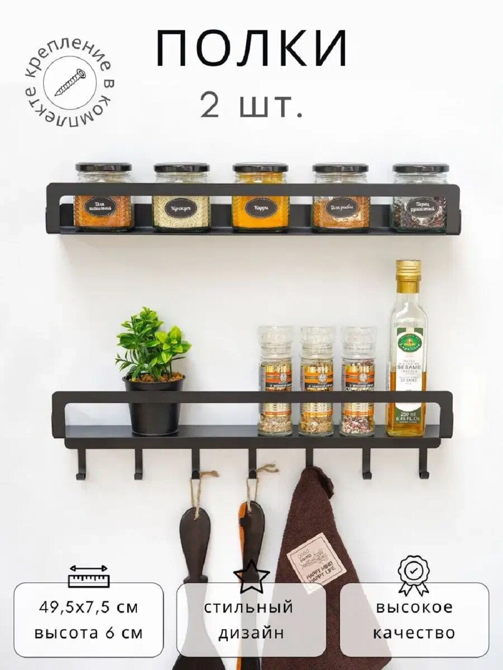 10 цен на Полка для кухни металлическая ElectricLight 49,5х7,5. 2 полки с крючками. Черная.