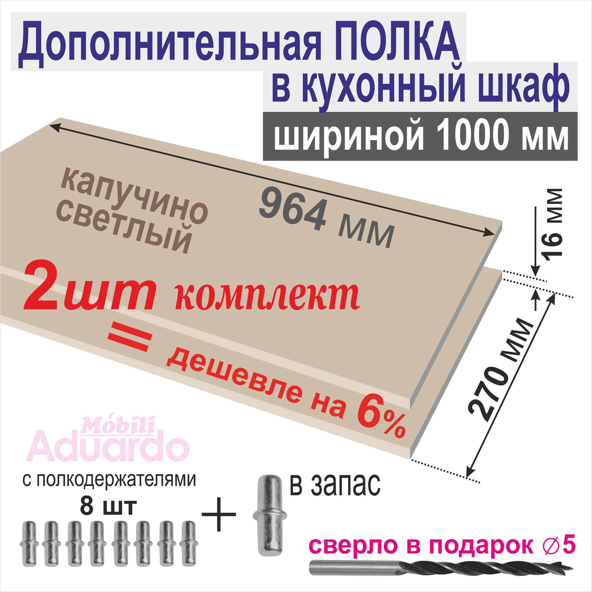 Полка Дополнительная (Комплект 2 шт) в Кухонный, Верхний шкаф 1 м, 964 х 270 х 16 мм; Цвет: Капучино Светлый, 2 шт. информация:
