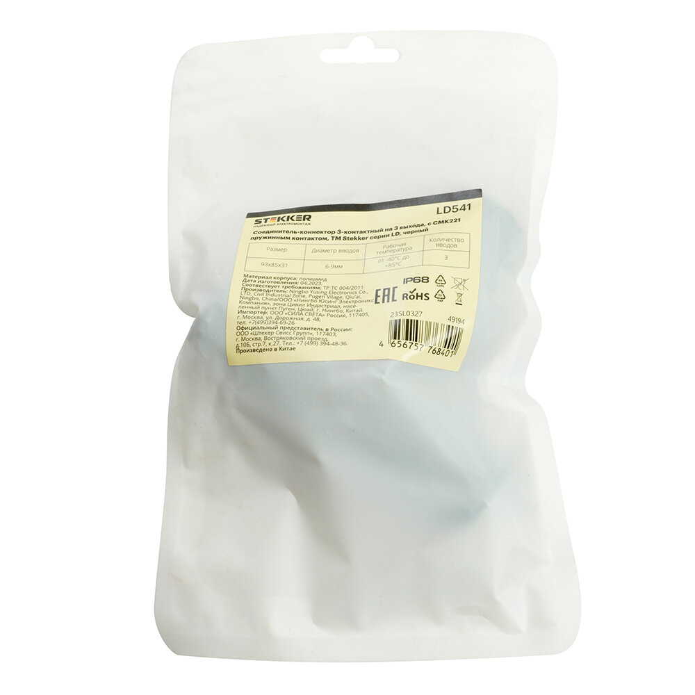 Соединитель-коннектор LD541 3-контактный на 3 выхода, с СМК221 пружинным контактом IP68, черный STEKKER 49194 fr_49194 информация: