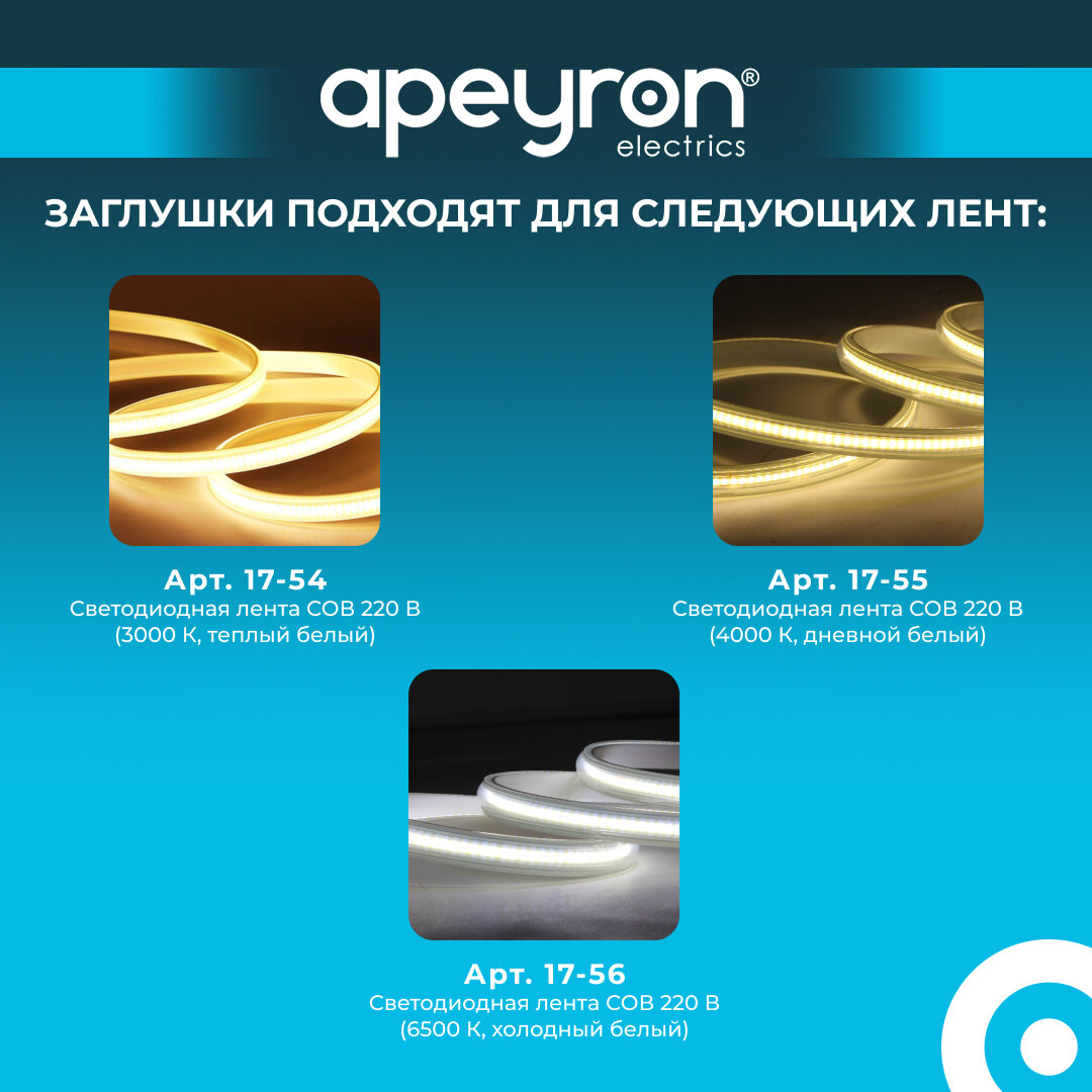 Комплект пластиковых заглушек Apeyron 09-140 (5шт) для светодиодной ленты COB 220В, арт.17-54,55,56 информация: