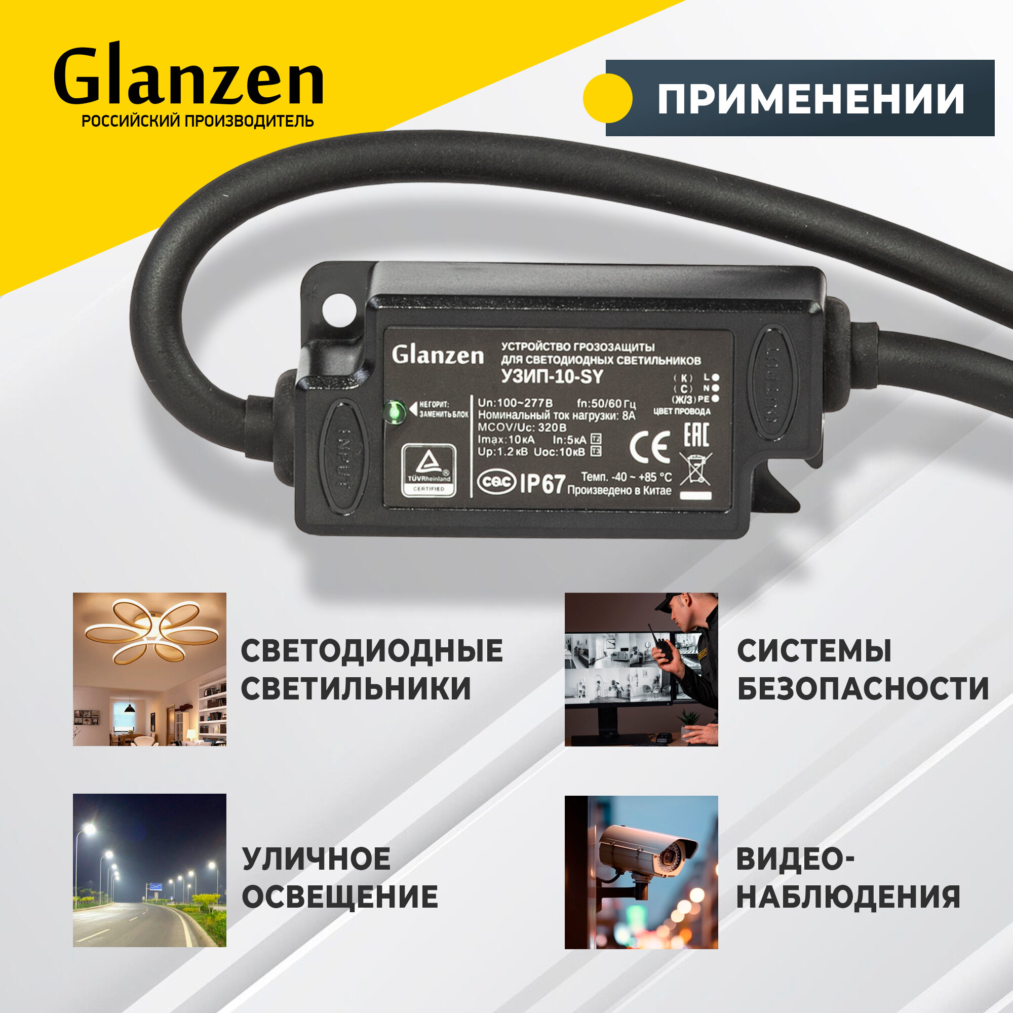 Стабилизатор грозозащиты от импульсных перенапряжений для светодиодных светильников УЗИП GLANZEN УЗИП-10-SY 8A информация: