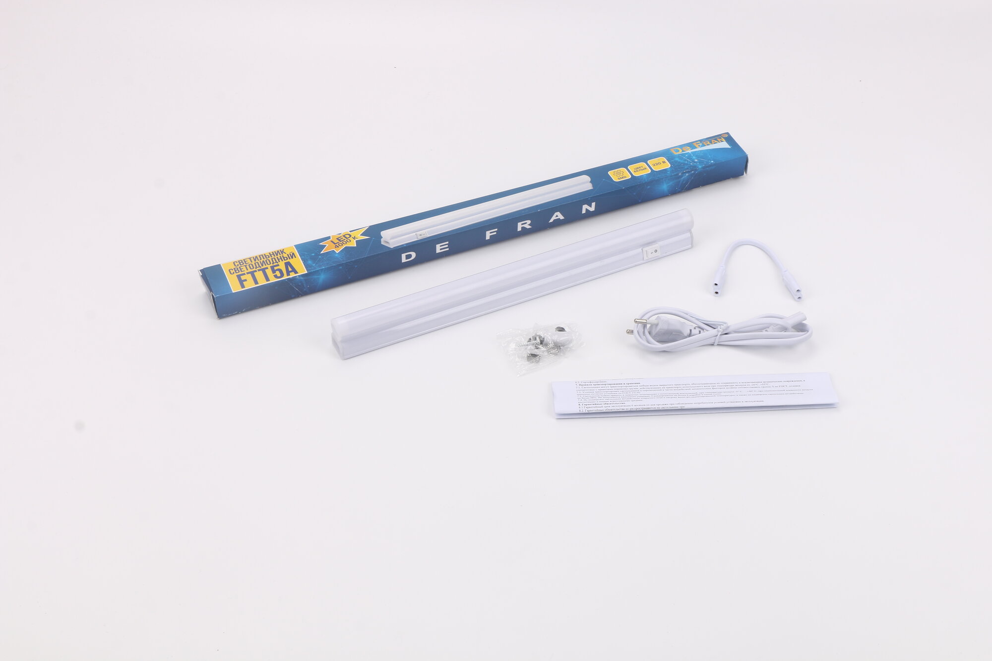 Светильник светодиодный De Fran линейный FTT5A Т5 4Вт 320Лм 4000К IC драйв, PC+выкл.+шнур 1м, 314*23*35мм, арт. SS0001 информация: