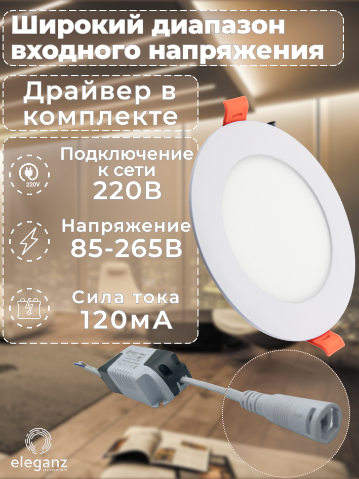 Cветильник потолочный металлический "Eleganz" 6вт, 220в круглый 4500К, для натяжного и подвесного потолка, белый, 1 шт. информация: