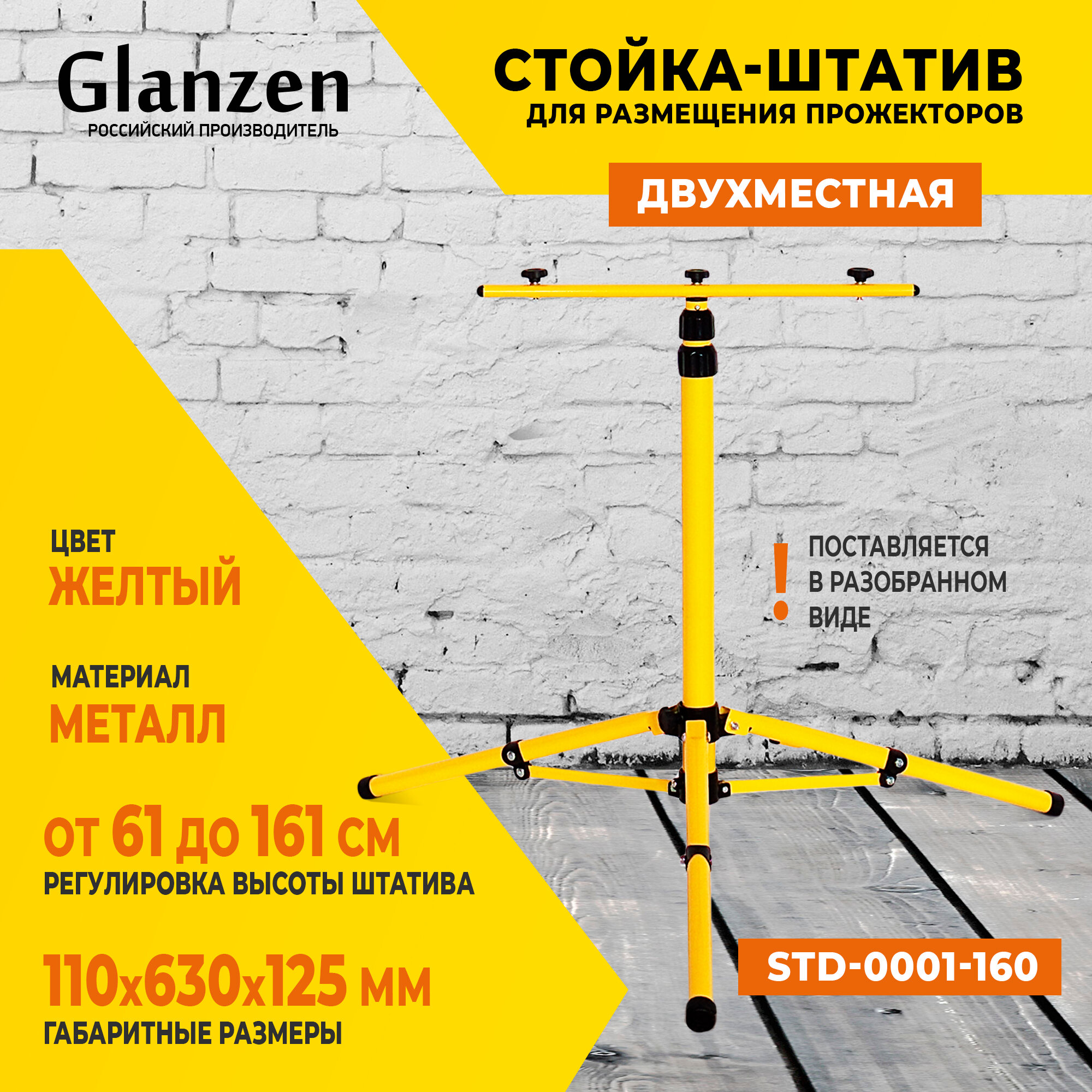 10 цен на Стойка для светодиодных прожекторов 1,6 м GLANZEN STD-0001-160 штатив напольный для 5-х прожекторов, желтый цвет