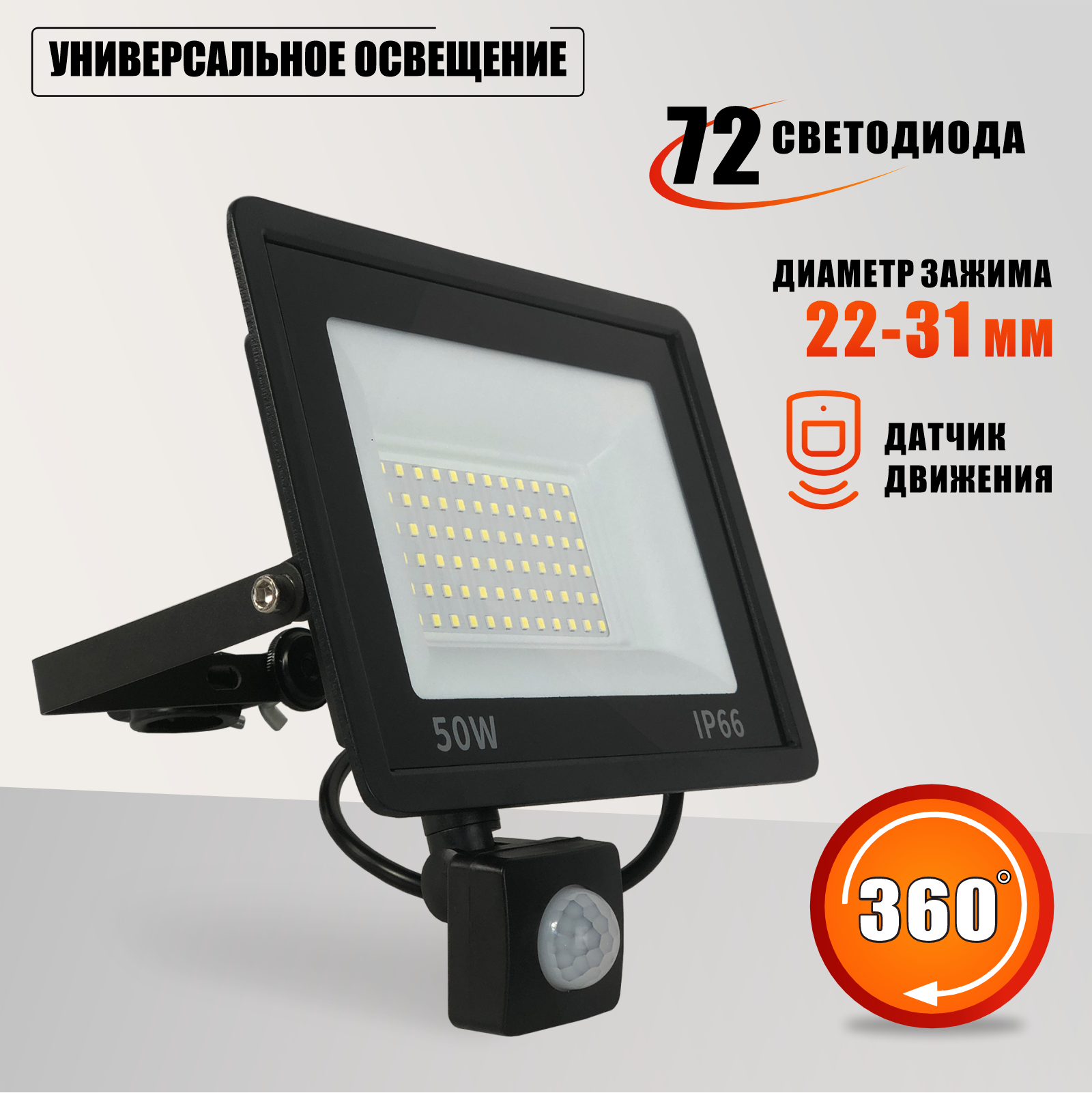Прожектор 50 Вт с датчиком движения на кронштейне с зажимом до 31 мм информация: