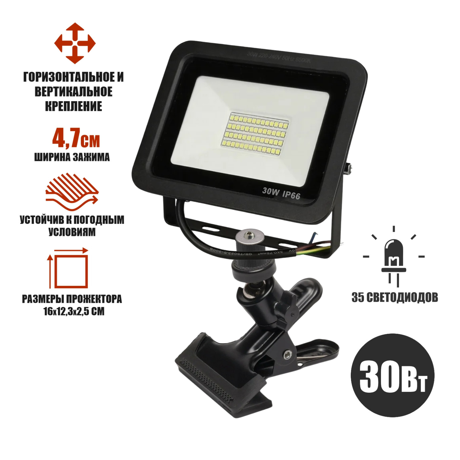 Светодиодный строительный прожектор 30 Вт на металлической прищепке PR1 для горизонтального и вертикального крепления информация: