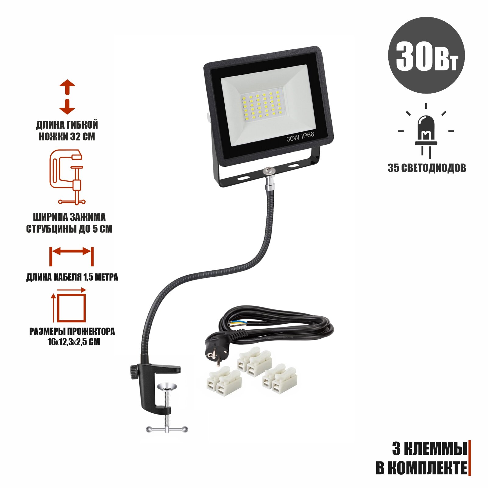 10 цен на Прожектор светодиодный 30Вт на гибком креплении и усиленной струбцине GDSUS-38 с кабелем 1,5 м и клеммами