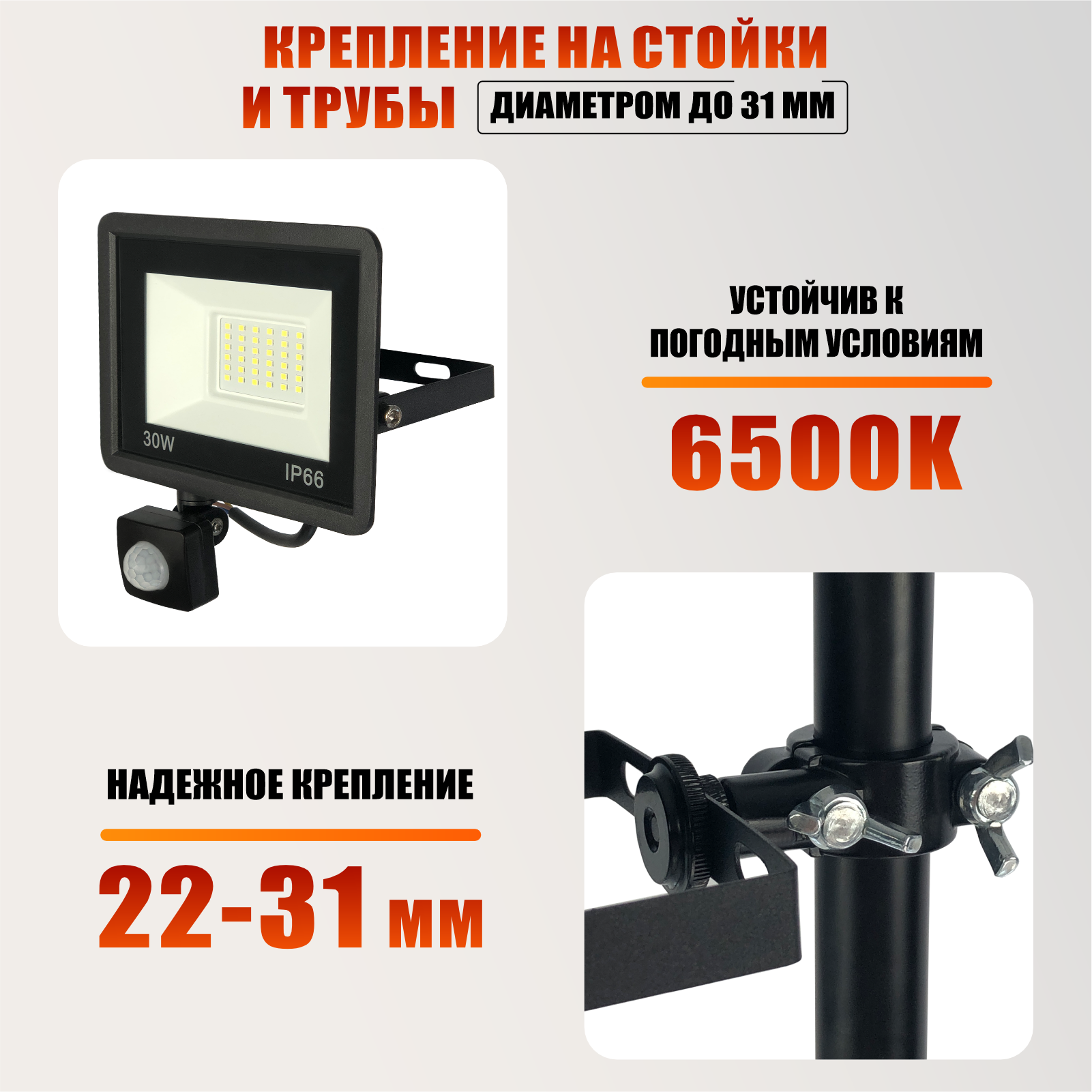 Отзывы на Прожектор 30 Вт с датчиком движения на кронштейне с зажимом до 31 мм