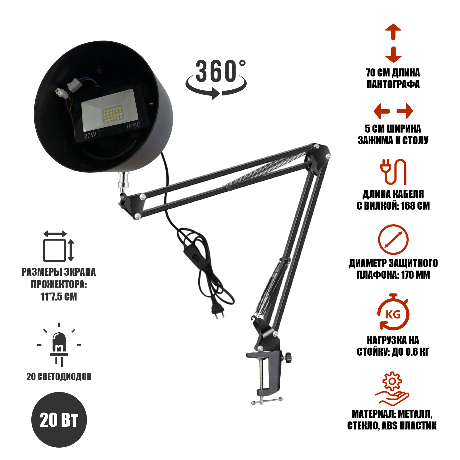Прожектор светодиодный 20Вт с настольным креплением NBS-BCAP и черным защитным плафоном на усиленной струбцине информация:
