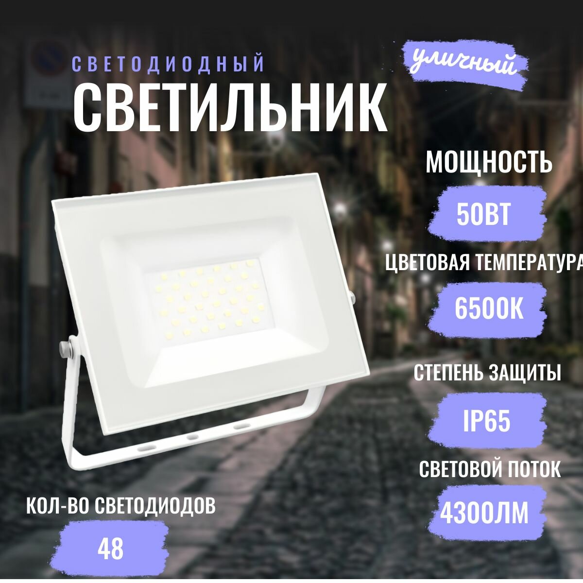 Прожектор светодиодный 50Вт, белый, IP65, 6500К (холодный белый) информация: