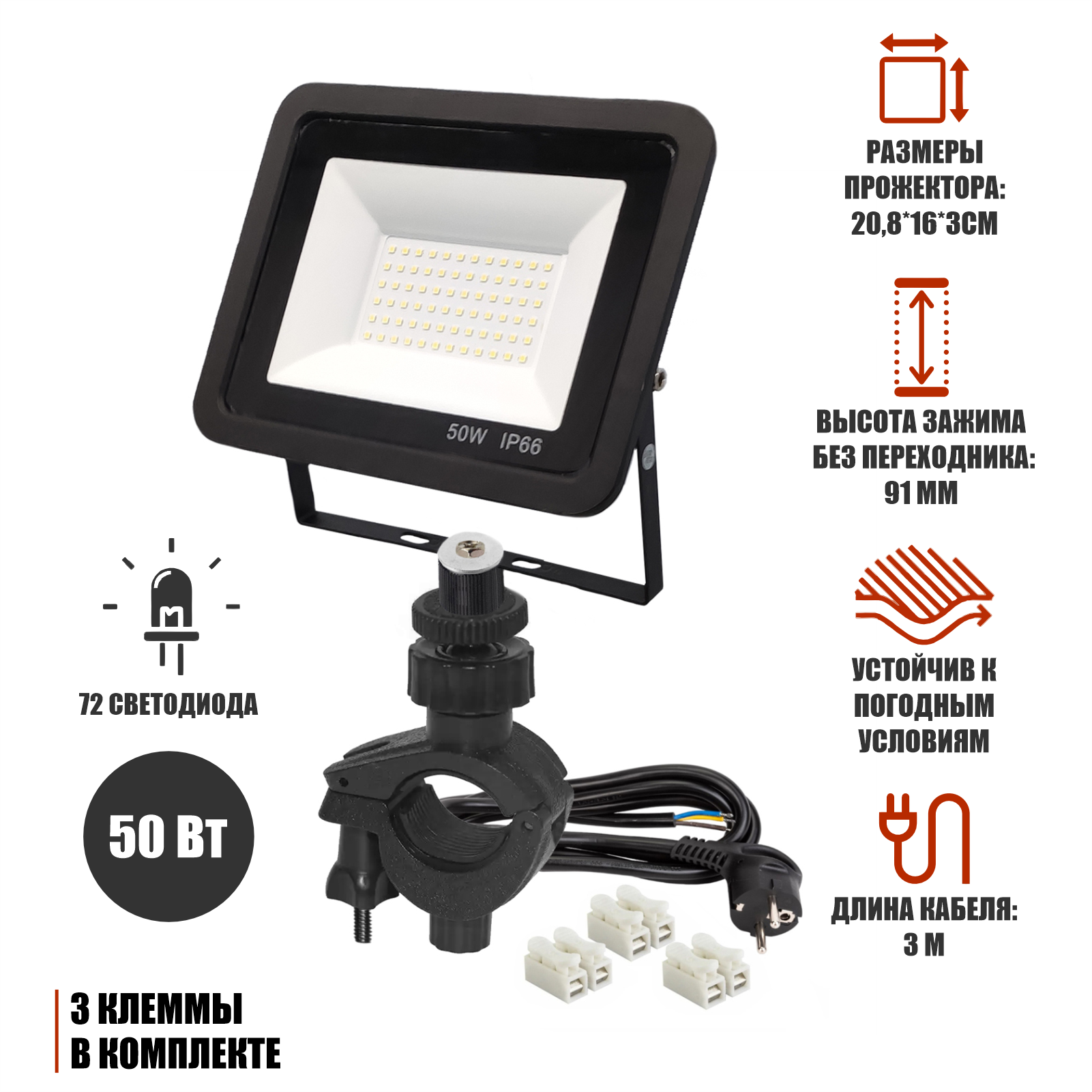 Светодиодный строительный прожектор 50 Вт с кабелем 3 м и клеммами на креплении зажиме 16-26 мм информация:
