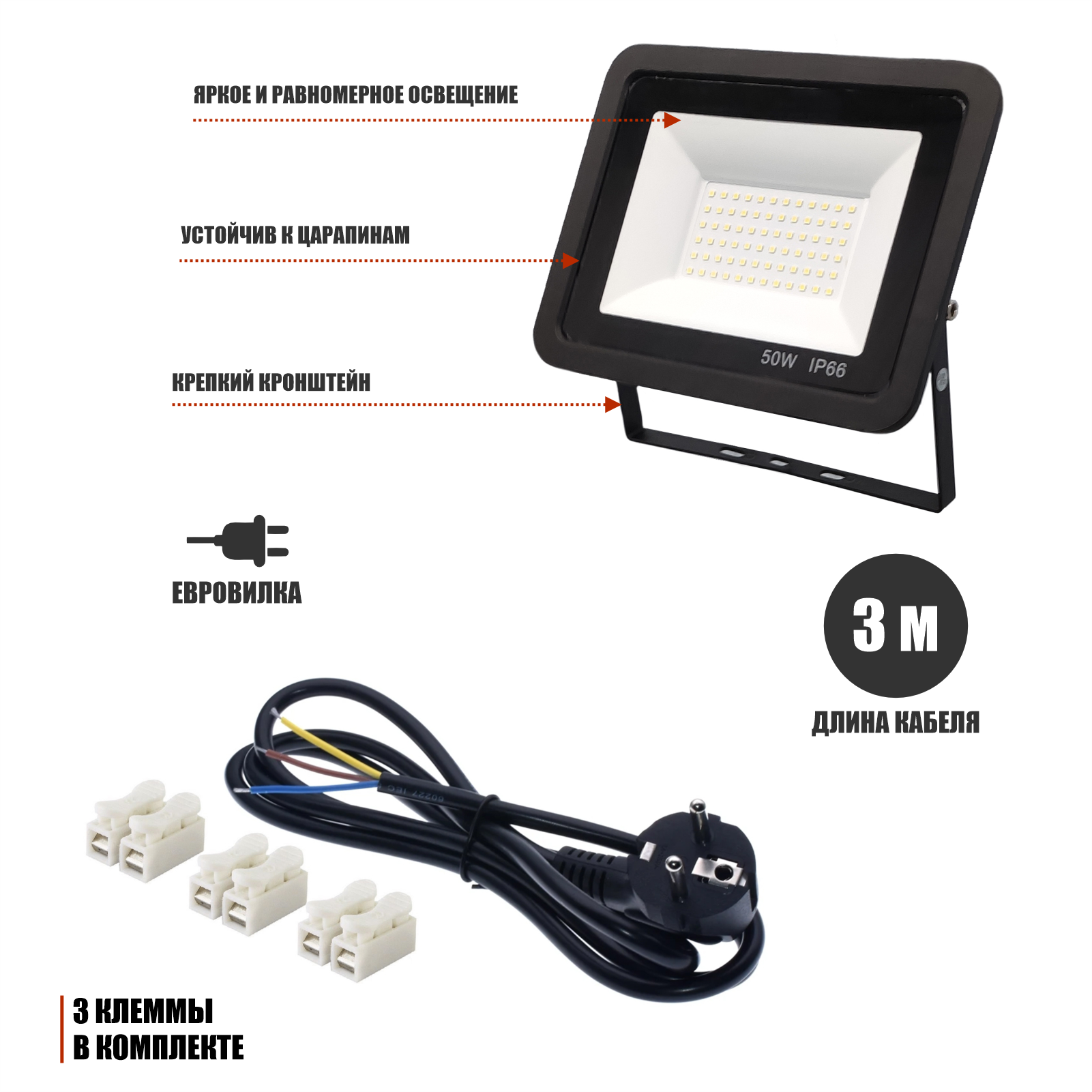 10 цен на Светодиодный строительный прожектор 50 Вт с кабелем 3 м и клеммами на креплении зажиме 16-26 мм